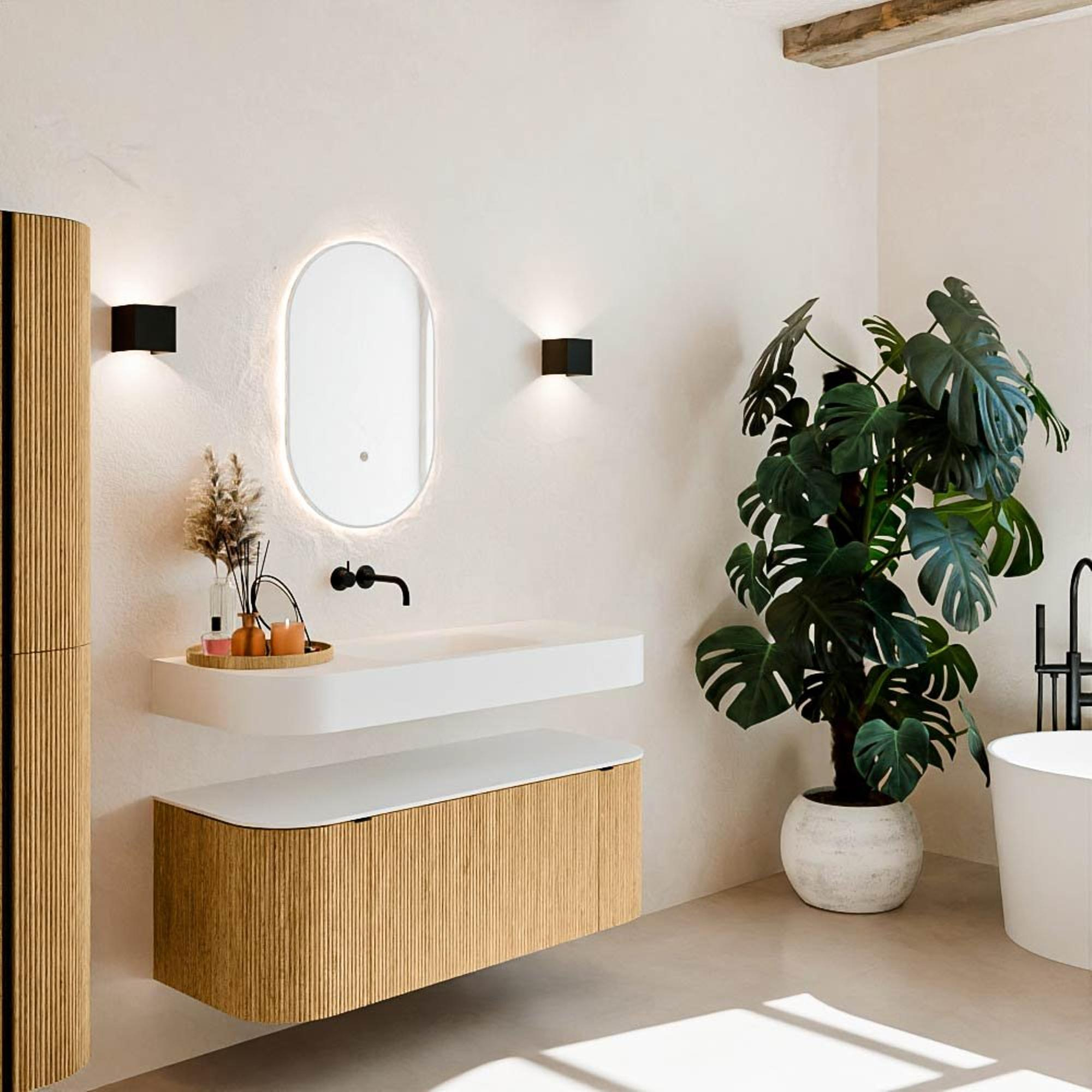 Matériaux naturels dans des tons chauds. Les nervures verticales apportent rythme et texture au design, tandis que le chêne confère une apparence chaleureuse et artisanale. Choisissez parmi 5 teintes de bois OAK, WALNUT, DUSK, SHADOW et RUBY, des couleurs de bois soigneusement sélectionnées pour enrichir les salles de bains modernes et classiques.