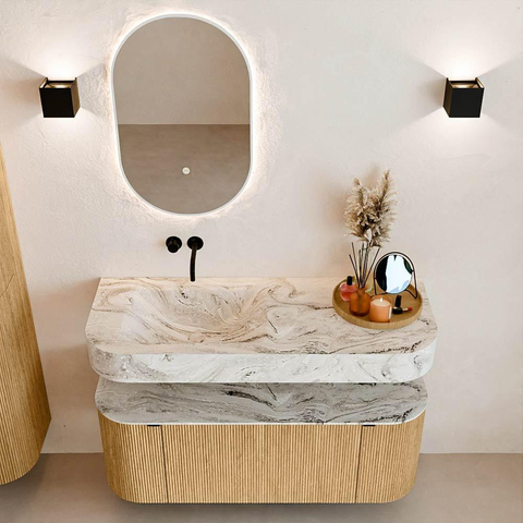 MONDIAZ THOR-DLUX 120cm meuble de salle de bains arrondi gauche + droite couleur Oak avec 1 tiroir et 2 portes. Vasque suspendue CLOUD gauche sans trou de robinet couleur Glace.
