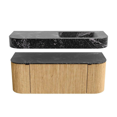 MONDIAZ THOR-DLUX 120cm meuble de salle de bains arrondi gauche + droite couleur Oak avec 1 tiroir et 2 portes. Vasque suspendue CLOUD droite 1 trou de robinet couleur Lava.
