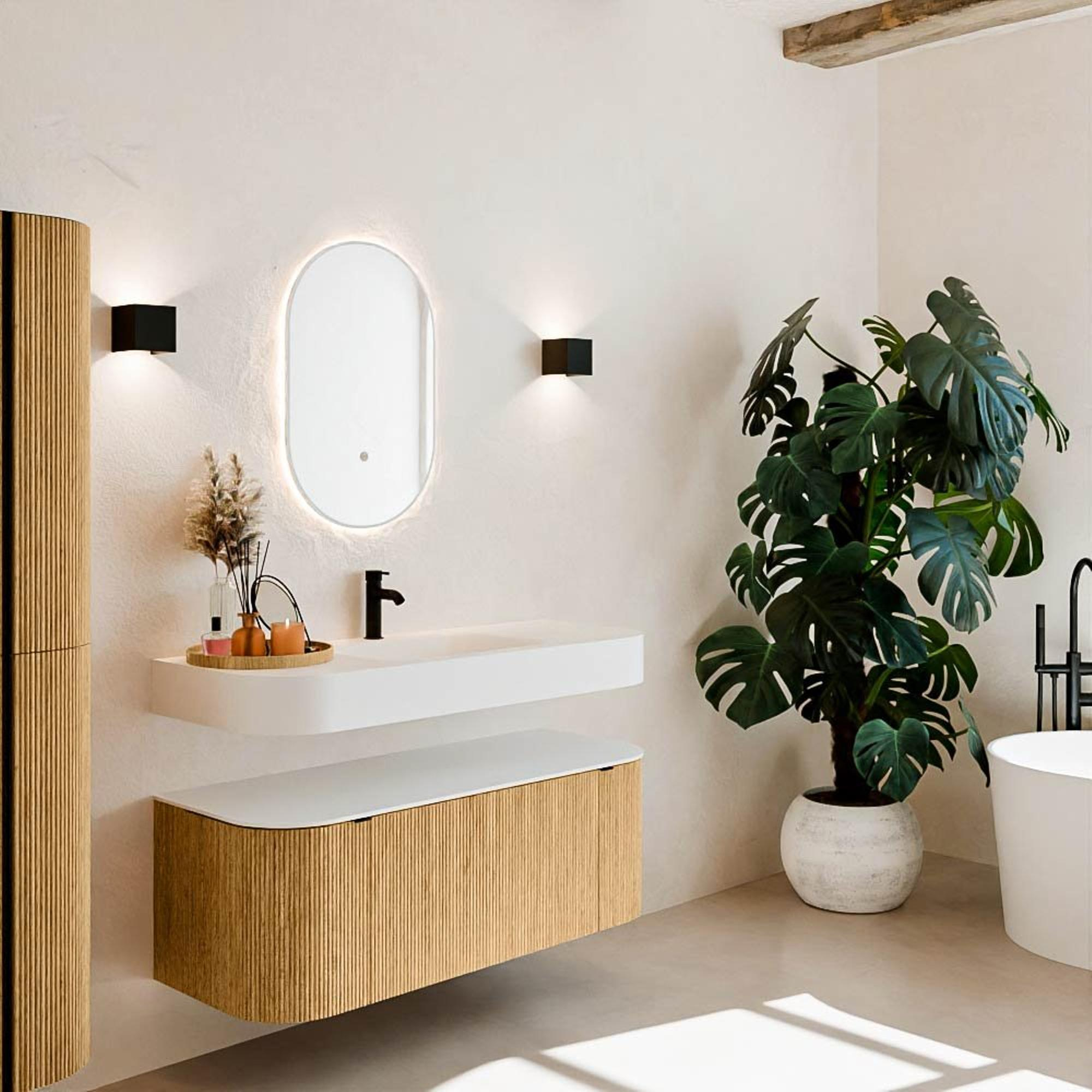Matériaux naturels dans des teintes chaudes. Les rainures verticales apportent rythme et texture au design, tandis que le chêne confère une apparence chaleureuse et artisanale. Choisissez parmi 5 teintes de bois OAK, WALNUT, DUSK, SHADOW et RUBY, des couleurs de bois soigneusement sélectionnées pour enrichir les salles de bains modernes et classiques.