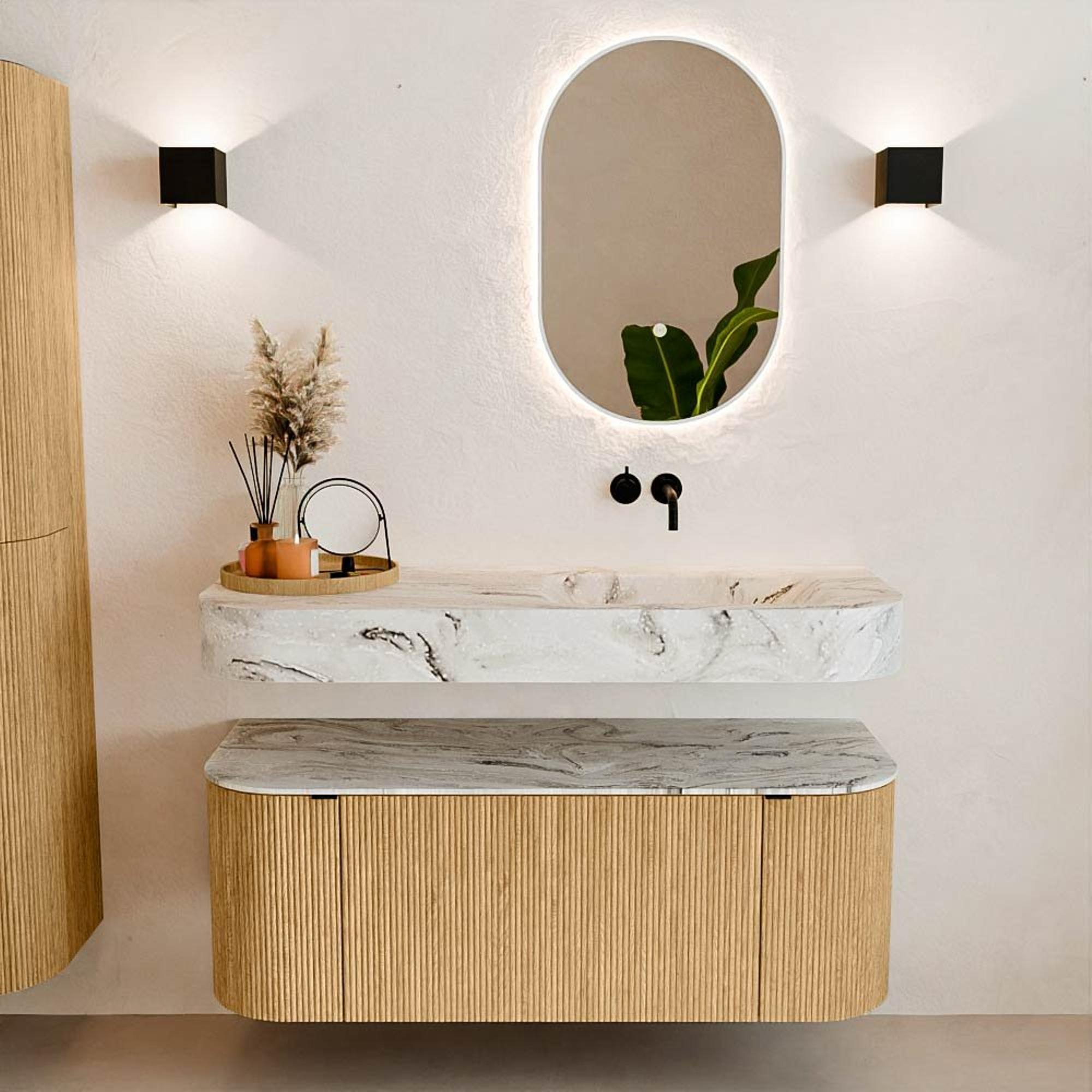 Matériaux naturels dans des tons chauds. Les nervures verticales apportent rythme et texture au design, tandis que le chêne confère une apparence chaleureuse et artisanale. Choisissez parmi 5 teintes de bois OAK, WALNUT, DUSK, SHADOW et RUBY, des couleurs de bois soigneusement sélectionnées pour enrichir les salles de bains modernes et classiques.