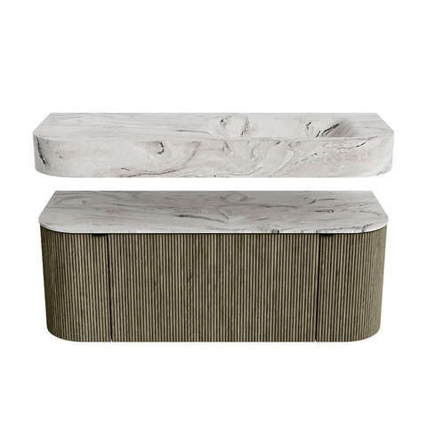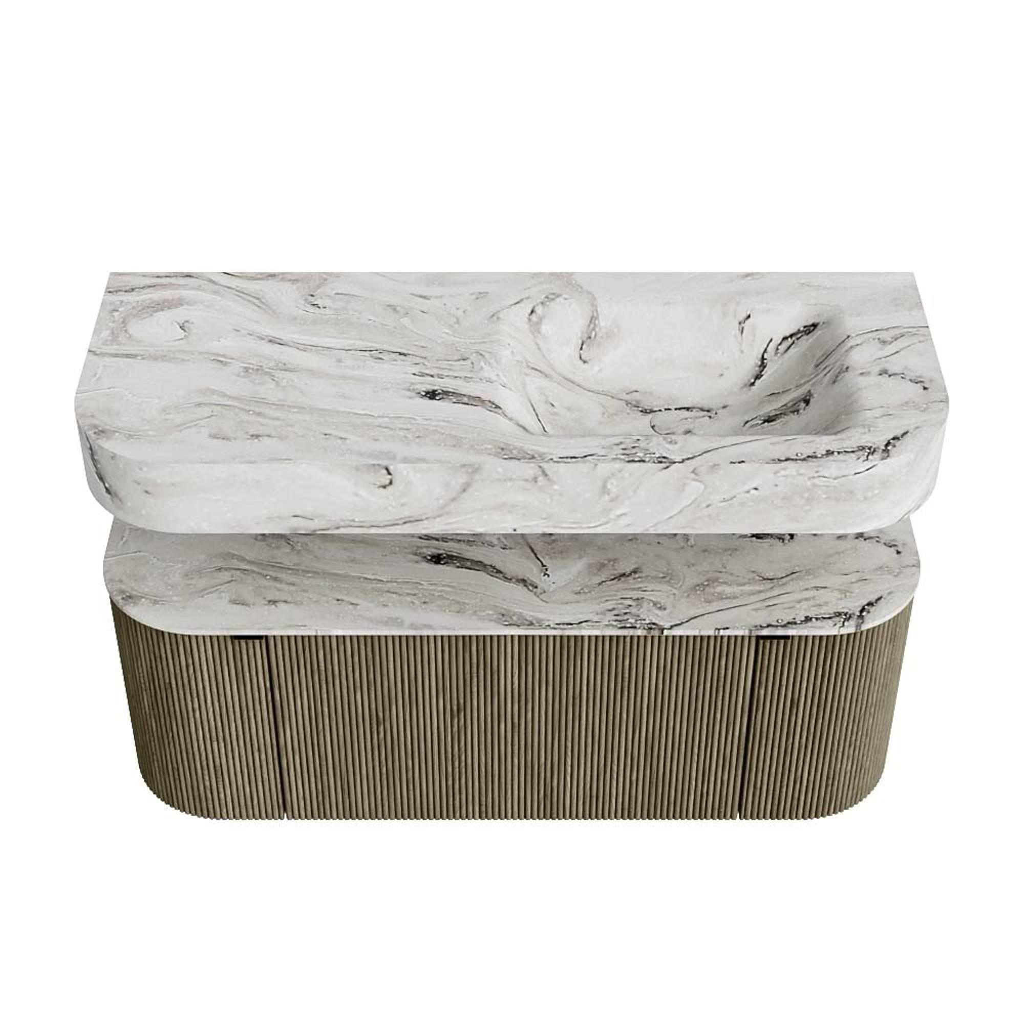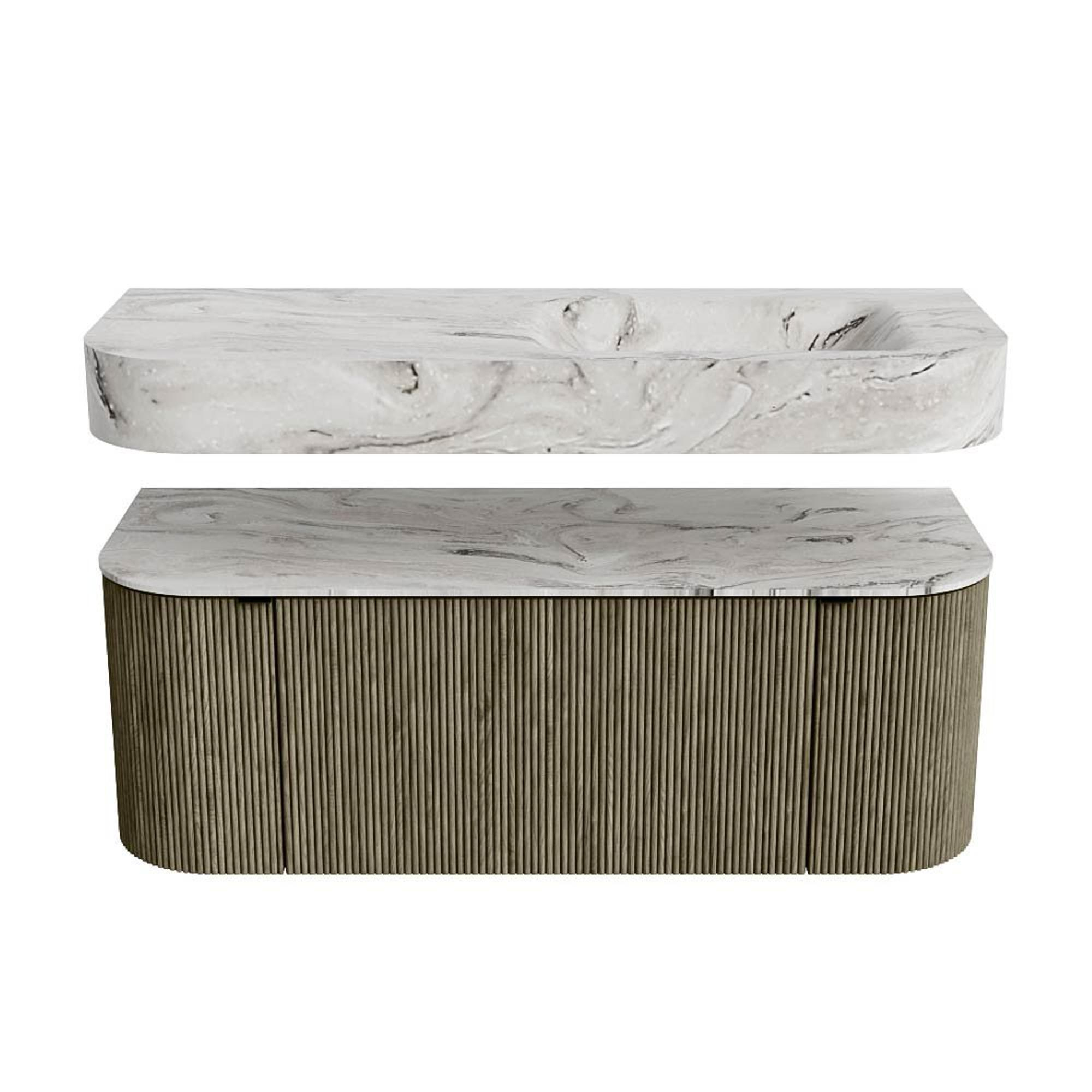 MONDIAZ THOR-DLUX 120cm meuble de salle de bains arrondi gauche + droite couleur Shadow avec 1 tiroir et 2 portes. Vasque suspendue CLOUD Droite 1 trou de robinet couleur Glace.