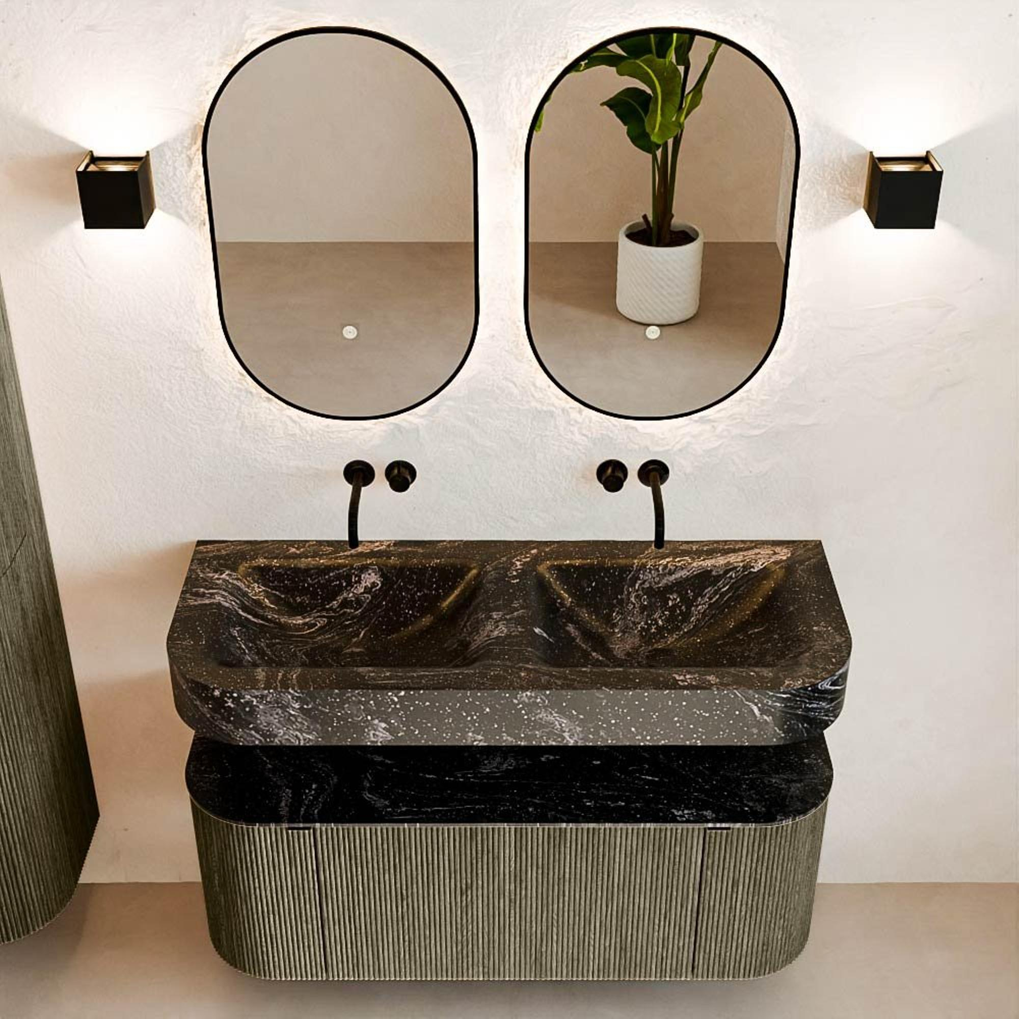 MONDIAZ THOR-DLUX 120cm meuble de salle de bains arrondi gauche + droite couleur Shadow avec 1 tiroir et 2 portes. Vasque suspendue CLOUD Double sans trou de robinet couleur Lava.