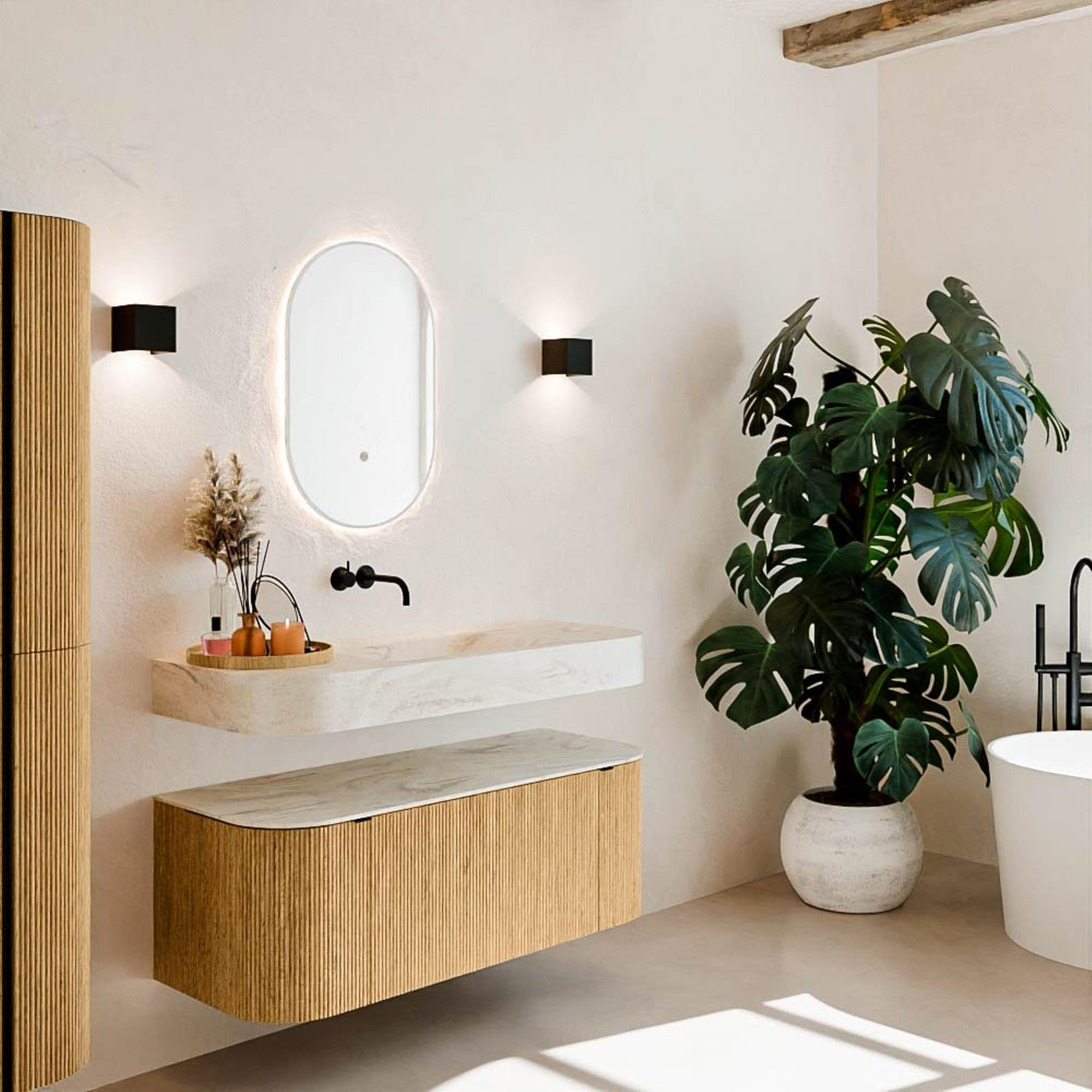 Matériaux naturels dans des tons chauds. Les cannelures verticales apportent rythme et texture au design, tandis que le chêne confère une apparence chaleureuse et artisanale. Choisissez parmi 5 teintes de bois OAK, WALNUT, DUSK, SHADOW et RUBY, des couleurs de bois soigneusement sélectionnées pour enrichir les salles de bains modernes et classiques.