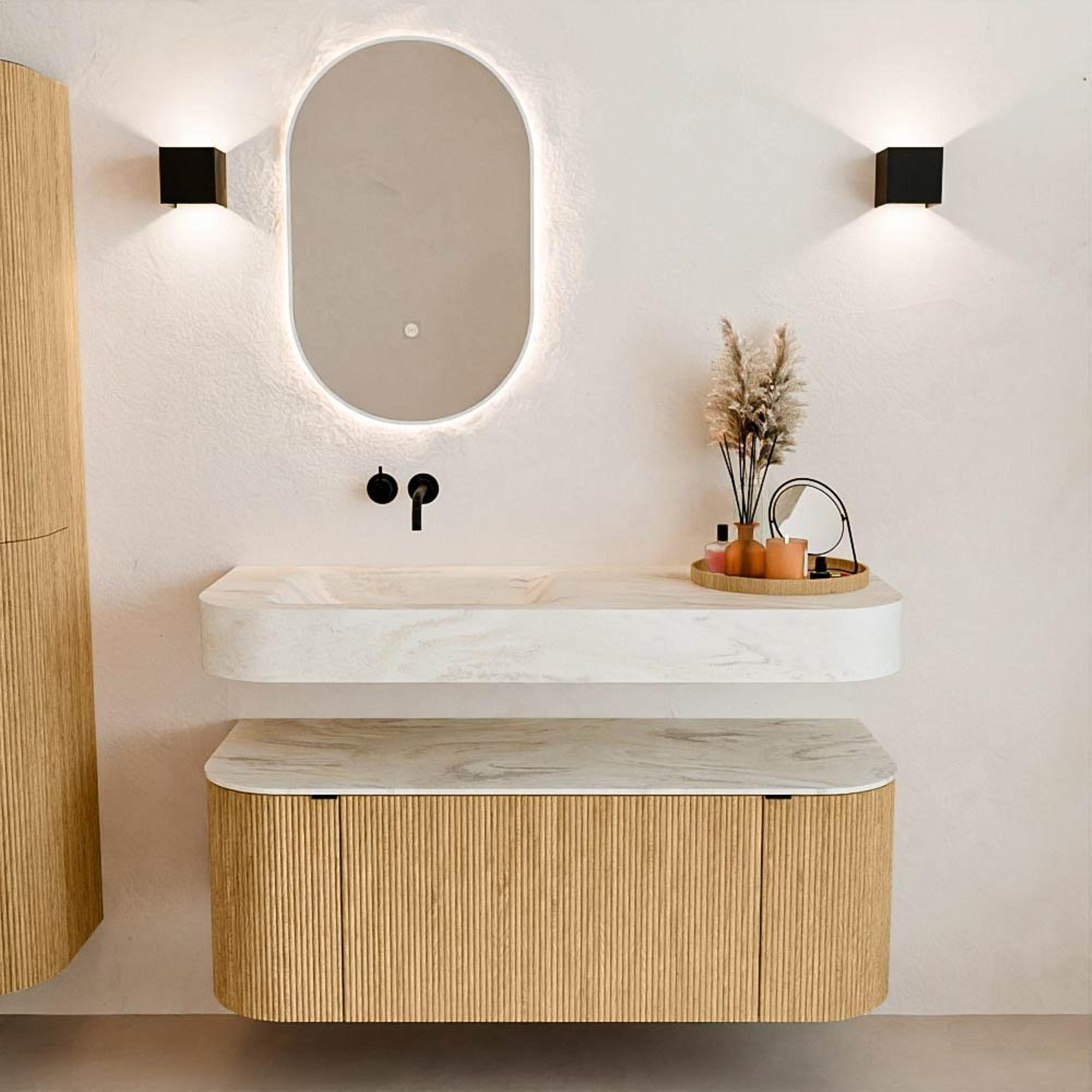 Au-dessus du meuble flotte une vasque suspendue assortie aux coins arrondis – parfaitement adaptée à la forme du meuble. La vasque est réalisée en Solid Surface et suit subtilement les lignes du meuble inférieur, créant ainsi un ensemble harmonieux. Le plan de travail en Solid Surface forme une base solide, facile d'entretien et complète la combinaison.
