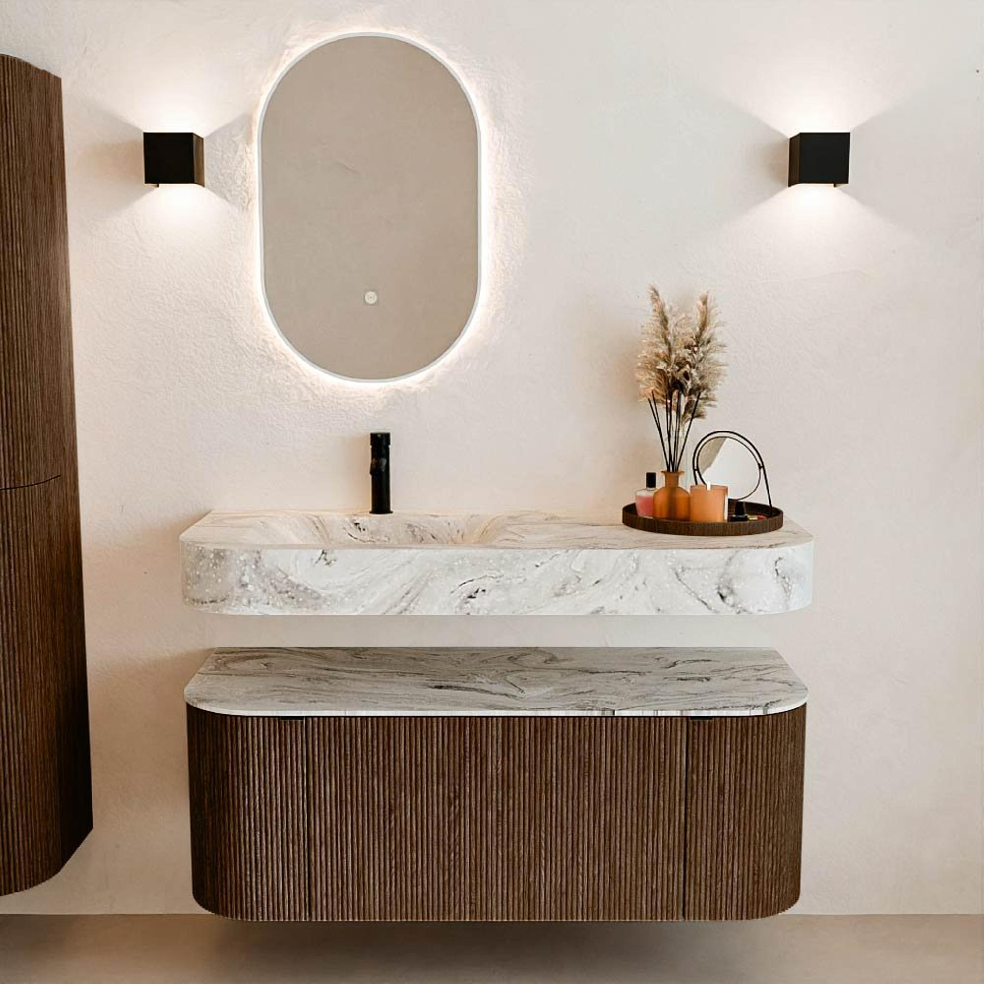 MONDIAZ THOR-DLUX 120cm meuble de salle de bains arrondi gauche + droite couleur Walnut avec 1 tiroir et 2 portes. Vasque suspendue CLOUD gauche 1 trou de robinet couleur Glace.