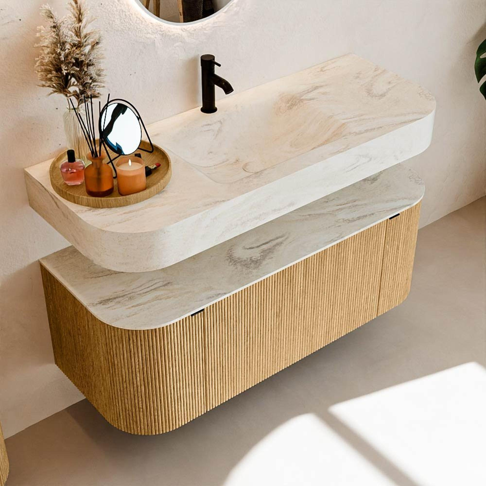 MONDIAZ THOR-DLUX Meuble de salle de bains - 120cm - arrondi gauche + droite - couleur Oak - 1 tiroir - 2 portes - Vasque suspendue CLOUD Milieu 1 trou de robinet couleur Ostra