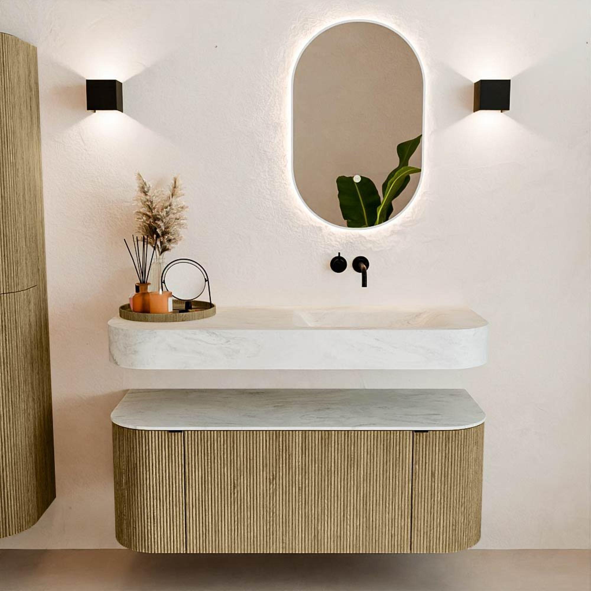 Au-dessus du meuble flotte une vasque suspendue assortie aux coins arrondis – parfaitement adaptée à la forme du meuble. La vasque est réalisée en Solid Surface et suit subtilement les lignes du meuble inférieur, créant un ensemble harmonieux. Le plan de travail en Solid Surface forme une base solide, facile d'entretien et complète la combinaison.