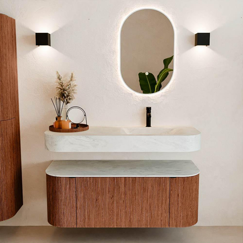 Matériaux naturels dans des teintes chaudes. Les nervures verticales apportent rythme et texture au design, tandis que le chêne confère une apparence chaleureuse et artisanale. Choisissez parmi 5 teintes de bois OAK, WALNUT, DUSK, SHADOW et RUBY, des couleurs de bois soigneusement sélectionnées pour enrichir les salles de bains modernes et classiques.
