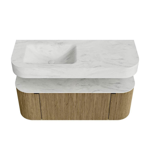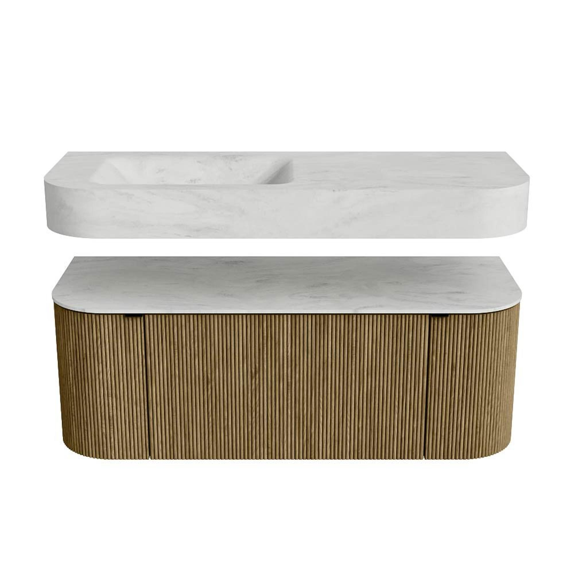 Un lavabo suspendu assorti flotte au-dessus du meuble avec des coins arrondis – parfaitement adapté à la forme du meuble. Réalisé en Solid Surface, le lavabo suit subtilement les lignes du meuble inférieur, créant un ensemble harmonieux. Le plan en Solid Surface forme une base robuste et facile à entretenir, complétant ainsi la combinaison.