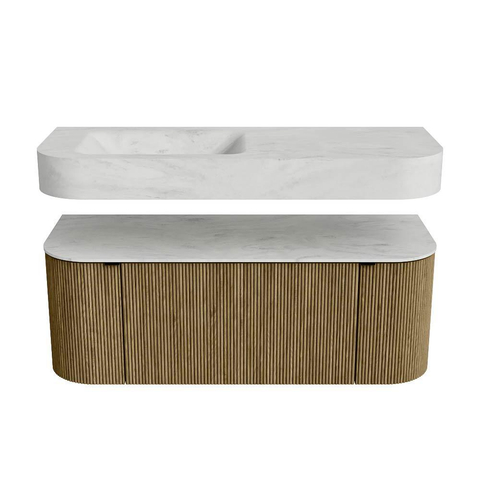 MONDIAZ THOR-DLUX 120cm meuble de salle de bains arrondi gauche + droite couleur Dusk avec 1 tiroir et 2 portes. Vasque suspendue CLOUD Gauche 1 trou de robinet couleur Opalo.