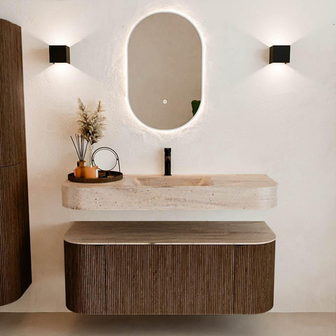 Matériaux naturels dans des tons chauds. Les rainures verticales apportent rythme et texture au design, tandis que le chêne confère une apparence chaleureuse et artisanale. Choisissez parmi 5 teintes de bois OAK, WALNUT, DUSK, SHADOW et RUBY, des couleurs de bois soigneusement sélectionnées pour enrichir les salles de bains modernes et classiques.