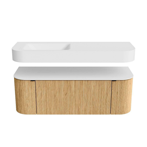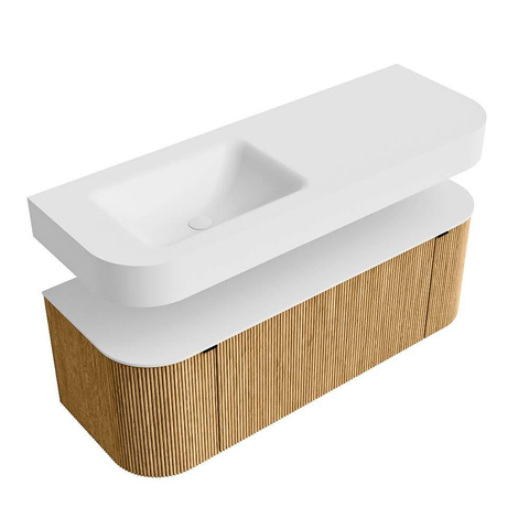 Boven het meubel zweeft een bijpassende, vrij hangende wastafel met afgeronde hoeken – perfect afgestemd op de vorm van de kast. De wastafel is uitgevoerd in Solid Surface en volgt subtiel de lijnen van het onderliggende meubel, waardoor een harmonieus geheel ontstaat. Het Solid Surface topblad vormt een sterke, onderhoudsvriendelijke basis en maakt de combinatie compleet.