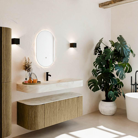 Matériaux naturels dans des tons chauds. Les cannelures verticales apportent rythme et texture au design, tandis que le chêne confère une apparence chaleureuse et artisanale. Choisissez parmi 5 teintes de bois OAK, WALNUT, DUSK, SHADOW et RUBY, des couleurs de bois soigneusement sélectionnées pour enrichir les salles de bains modernes et classiques.