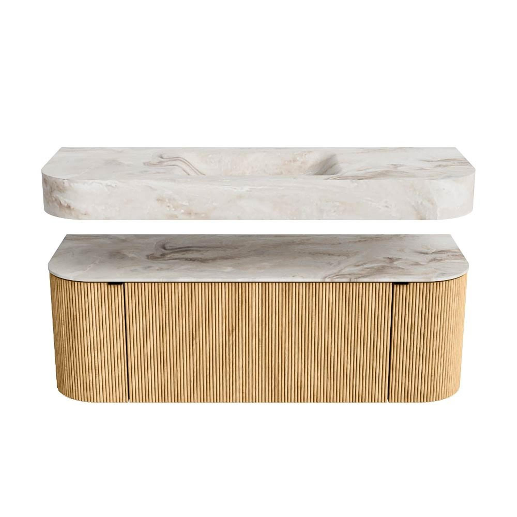 MONDIAZ THOR-DLUX 130cm meuble de salle de bains arrondi gauche + droite couleur Oak avec 1 tiroir et 2 portes. Vasque suspendue CLOUD Centre sans trou de robinet couleur Frappe.