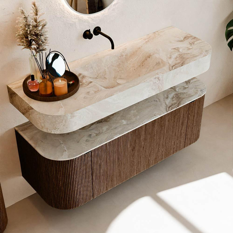 Matériaux naturels dans des tons chauds. Les cannelures verticales apportent rythme et texture au design, tandis que le chêne confère une apparence chaleureuse et artisanale. Choisissez parmi 5 teintes de bois OAK, WALNUT, DUSK, SHADOW et RUBY, des couleurs de bois soigneusement sélectionnées pour enrichir les salles de bains modernes et classiques.