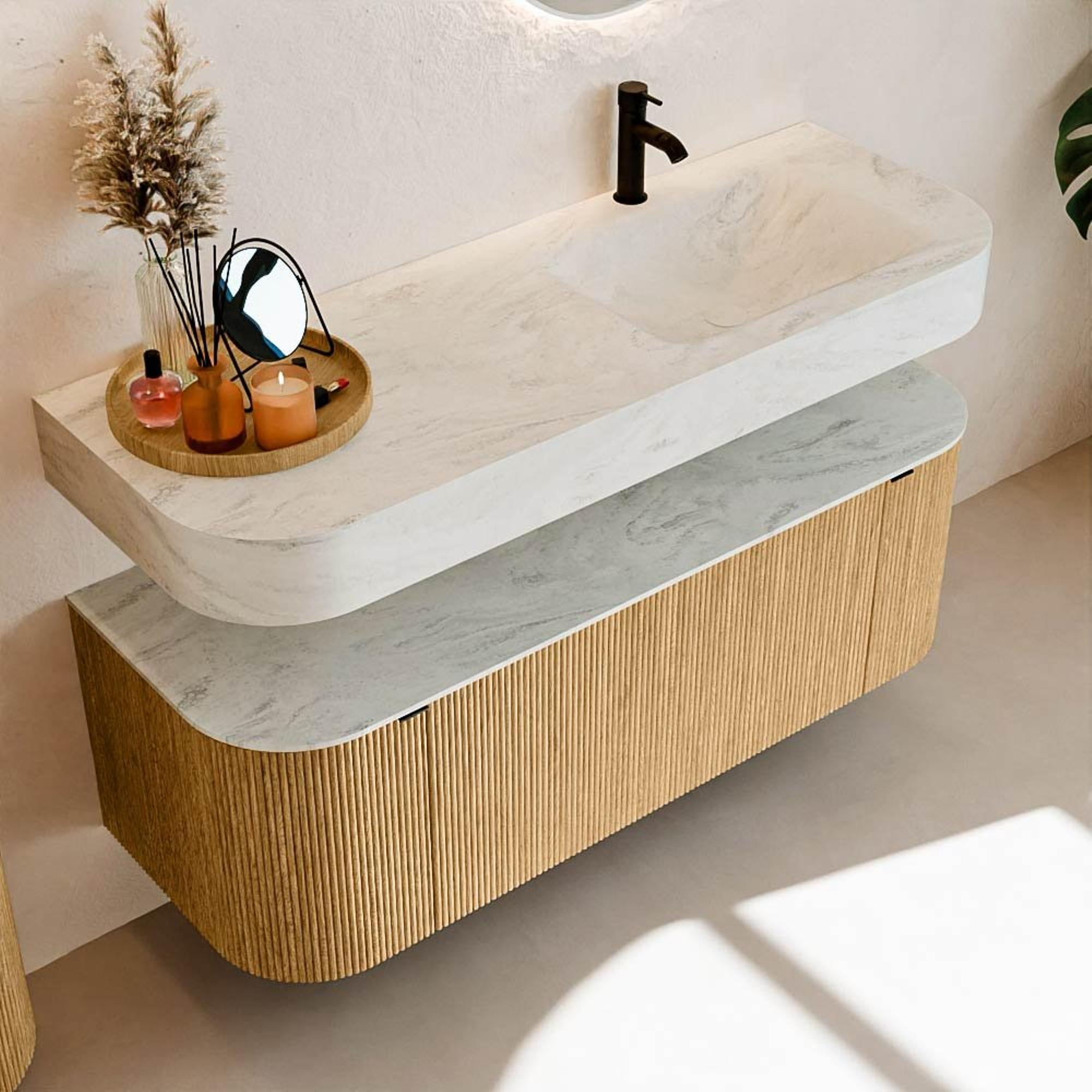 Au-dessus du meuble flotte une vasque suspendue assortie aux angles arrondis – parfaitement adaptée à la forme du meuble. La vasque est en Solid Surface et suit subtilement les lignes du meuble inférieur, créant un ensemble harmonieux. Le plan de travail en Solid Surface constitue une base solide, facile d'entretien et complète la combinaison.