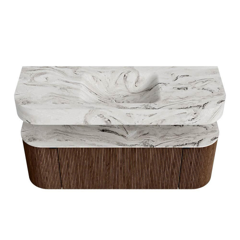 MONDIAZ THOR-DLUX 130cm meuble de salle de bains arrondi gauche + droite couleur Walnut avec 1 tiroir et 2 portes. Vasque suspendue CLOUD Milieu 1 trou de robinet couleur Glace.