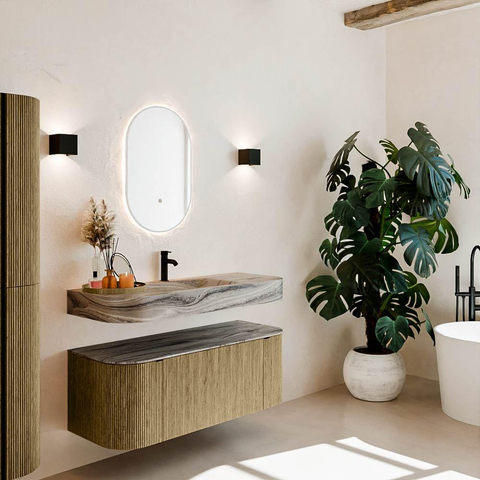 Matériaux naturels dans des tons chauds. Les reliefs verticaux apportent rythme et texture au design, tandis que le chêne confère une apparence chaleureuse et artisanale. Choisissez parmi 5 teintes de bois OAK, WALNUT, DUSK, SHADOW et RUBY, des couleurs de bois soigneusement sélectionnées pour enrichir les salles de bains modernes et classiques.