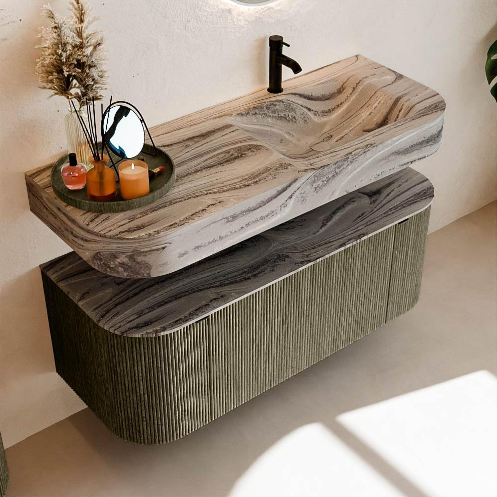 MONDIAZ THOR-DLUX Meuble de salle de bains 120cm arrondi gauche + droite couleur Shadow avec 1 tiroir et 2 portes. Vasque suspendue CLOUD Droite 1 trou de robinet couleur Sombra.