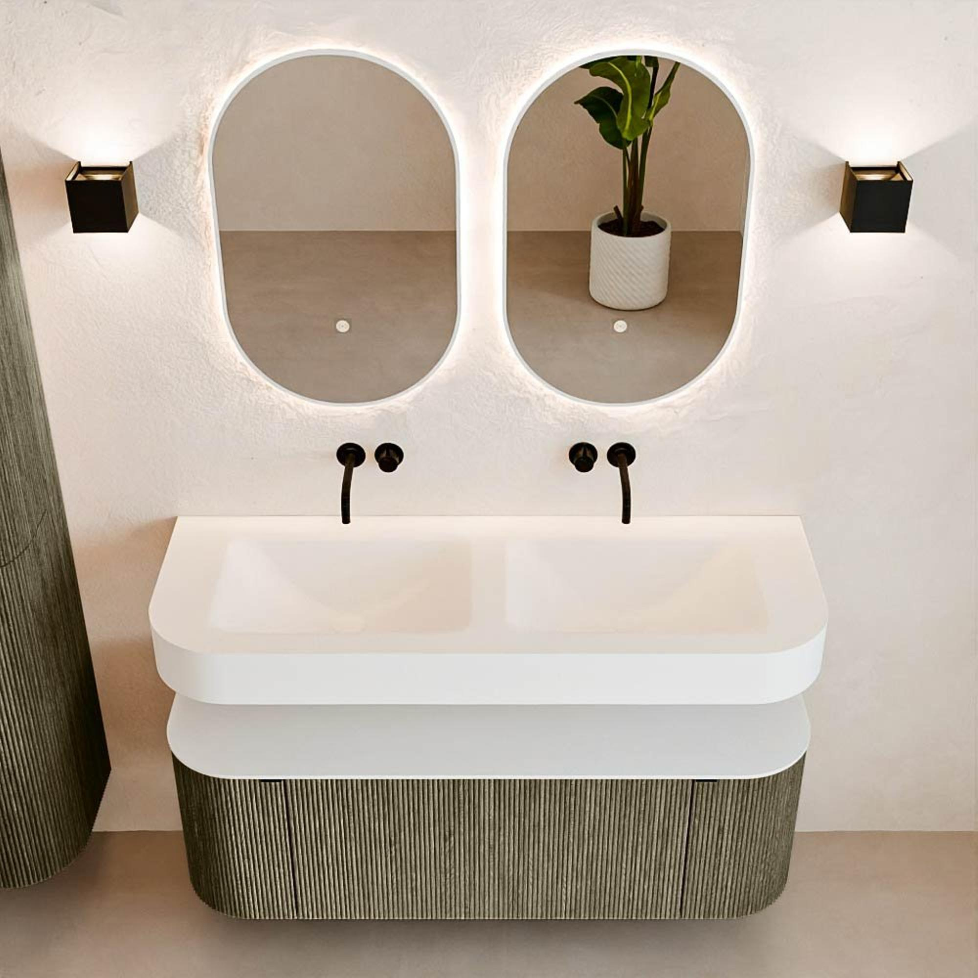 Au-dessus du meuble flotte une vasque suspendue assortie aux coins arrondis – parfaitement adaptée à la forme du meuble. La vasque est en Solid Surface et suit subtilement les lignes du meuble inférieur, créant une harmonie parfaite. Le plan de travail en Solid Surface constitue une base solide et facile d'entretien, complétant l'ensemble.