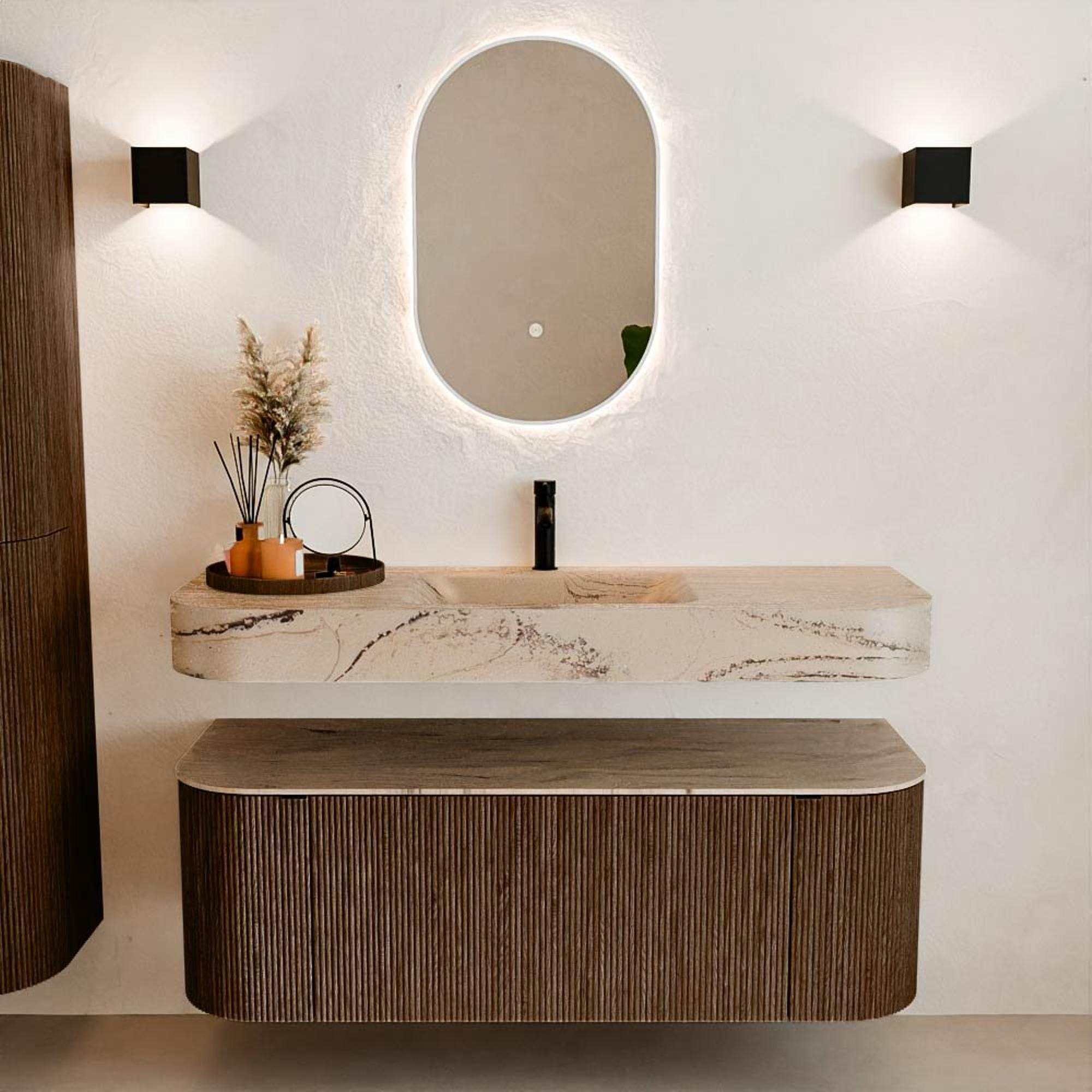 Matériaux naturels aux teintes chaudes. Les rainures verticales apportent rythme et texture au design, tandis que le chêne confère une apparence chaleureuse et artisanale. Choisissez parmi 5 teintes de bois OAK, WALNUT, DUSK, SHADOW et RUBY, des couleurs de bois soigneusement sélectionnées pour enrichir les salles de bains modernes et classiques.