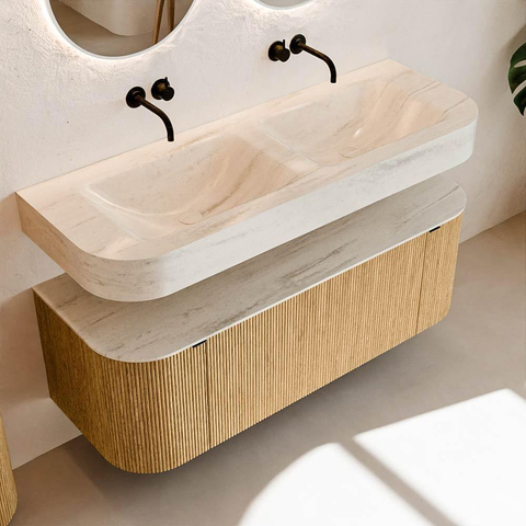 MONDIAZ THOR-DLUX 130cm meuble de salle de bains arrondi gauche + droite couleur Chêne avec 1 tiroir et 2 portes. Vasque suspendue CLOUD Double sans trou de robinet couleur Meli.