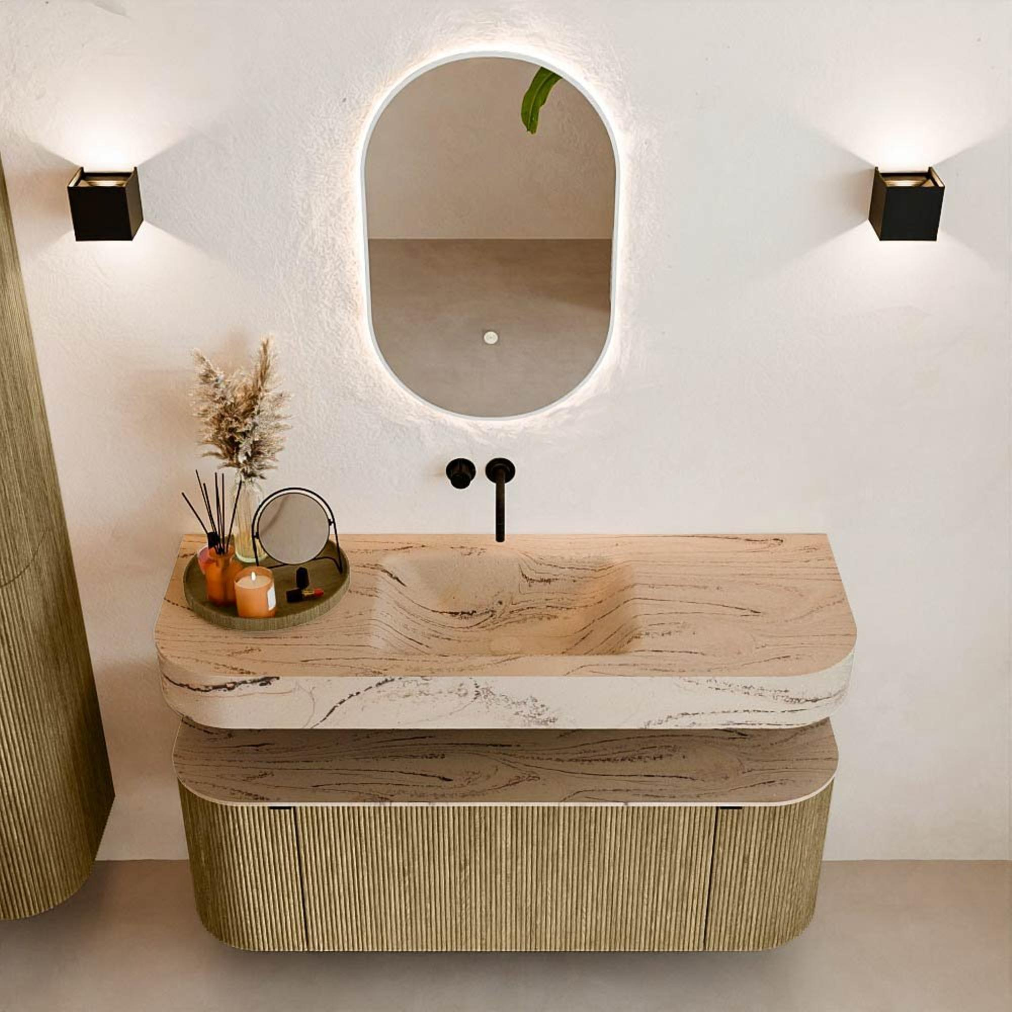 Matériaux naturels dans des tons chauds. Les nervures verticales apportent rythme et texture au design, tandis que le chêne confère une apparence chaleureuse et artisanale. Choisissez parmi 5 teintes de bois OAK, WALNUT, DUSK, SHADOW et RUBY, des couleurs de bois soigneusement sélectionnées pour enrichir les salles de bains modernes et classiques.