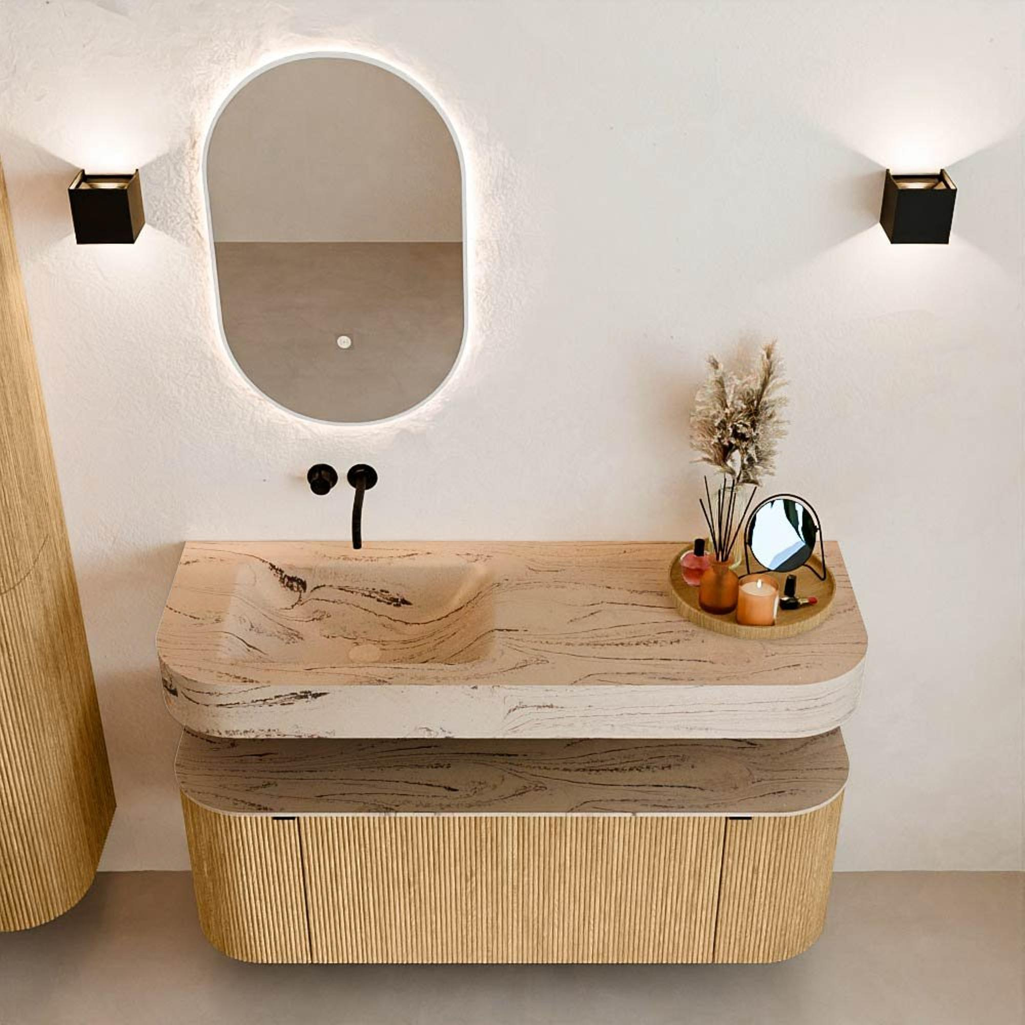MONDIAZ THOR-DLUX 130cm meuble de salle de bains arrondi gauche + droite couleur Oak avec 1 tiroir et 2 portes. Vasque suspendue CLOUD Gauche sans trou de robinet couleur Arena.