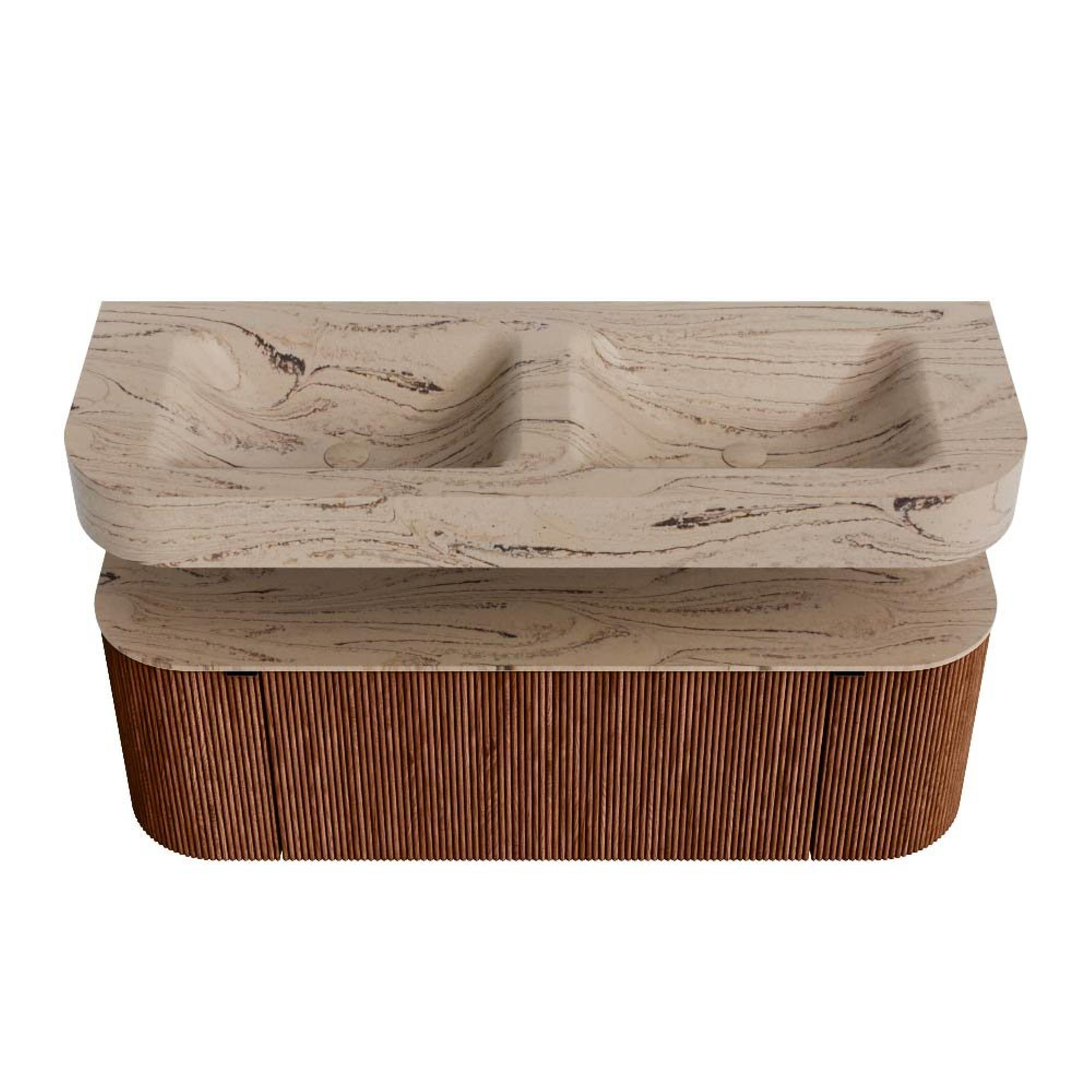 MONDIAZ THOR-DLUX 130cm meuble de salle de bains arrondi gauche + droite couleur Ruby avec 1 tiroir et 2 portes. Vasque suspendue CLOUD Double sans trou de robinet couleur Arena.
