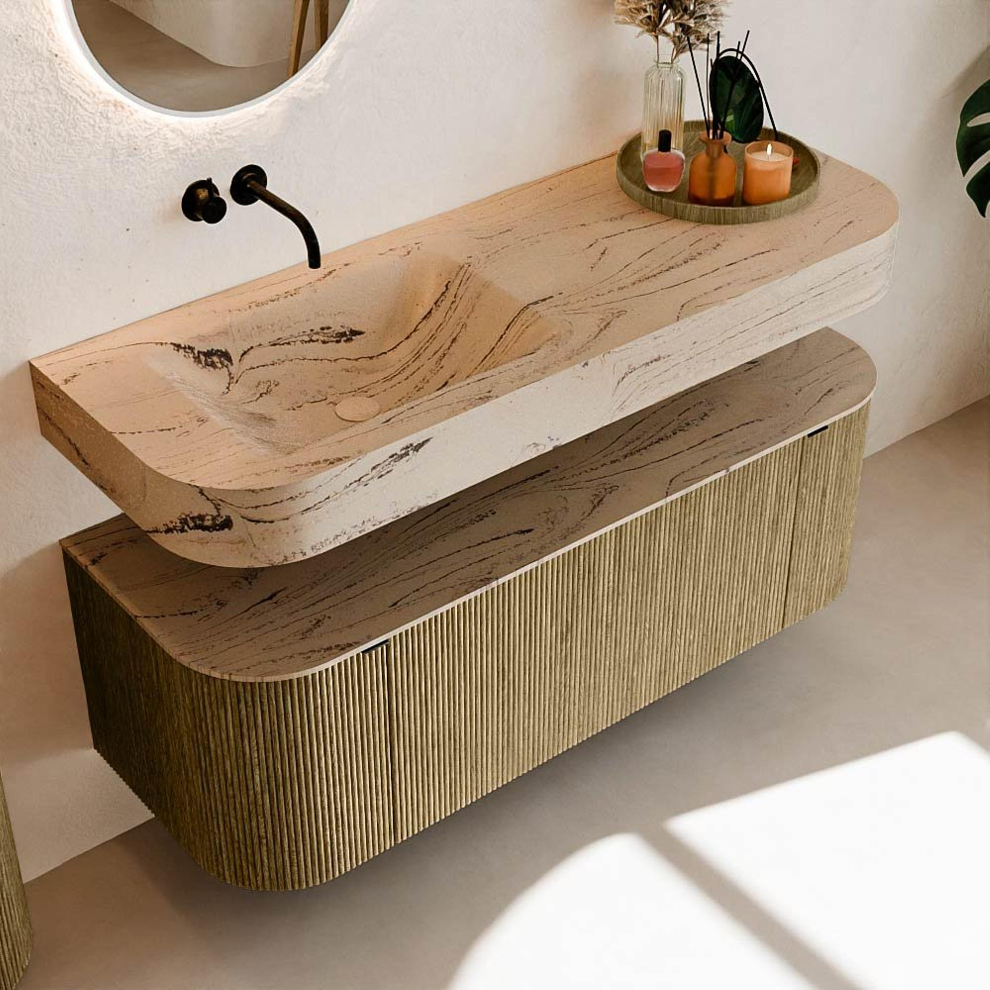 Matériaux naturels dans des tons chauds. Les nervures verticales apportent rythme et texture au design, tandis que le chêne confère une apparence chaleureuse et artisanale. Choisissez parmi 5 teintes de bois OAK, WALNUT, DUSK, SHADOW et RUBY, des couleurs de bois soigneusement sélectionnées pour enrichir les salles de bains modernes et classiques.