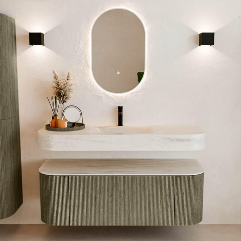Au-dessus du meuble flotte une vasque suspendue assortie aux coins arrondis – parfaitement adaptée à la forme du meuble. La vasque est réalisée en Solid Surface et suit subtilement les lignes du meuble inférieur, créant un ensemble harmonieux. Le plan de travail en Solid Surface constitue une base solide et facile d'entretien et complète la combinaison.