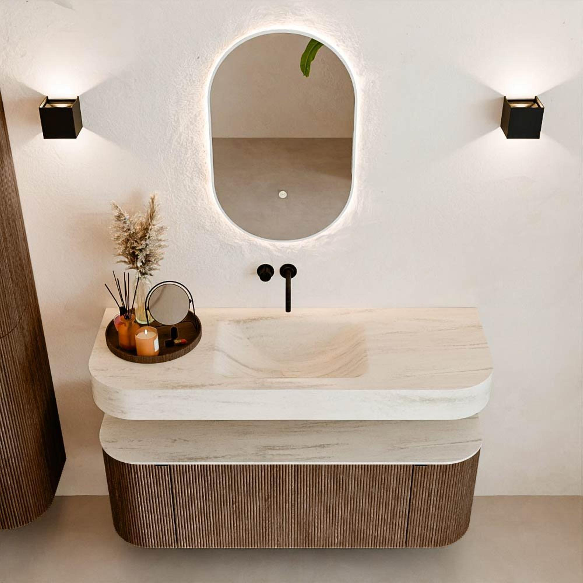 MONDIAZ THOR-DLUX Meuble de salle de bains 130cm arrondi gauche + droite couleur Walnut avec 1 tiroir et 2 portes. Vasque suspendue CLOUD Milieu sans trou de robinet couleur Meli.