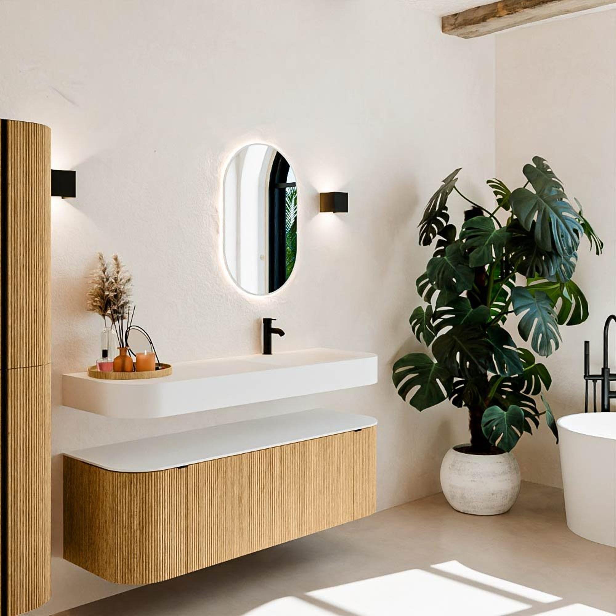 Matériaux naturels dans des tons chauds. Les reliefs verticaux apportent rythme et texture au design, tandis que le chêne confère une apparence chaleureuse et artisanale. Choisissez parmi 5 teintes de bois OAK, WALNUT, DUSK, SHADOW et RUBY, des couleurs de bois soigneusement sélectionnées pour enrichir les salles de bains modernes et classiques.