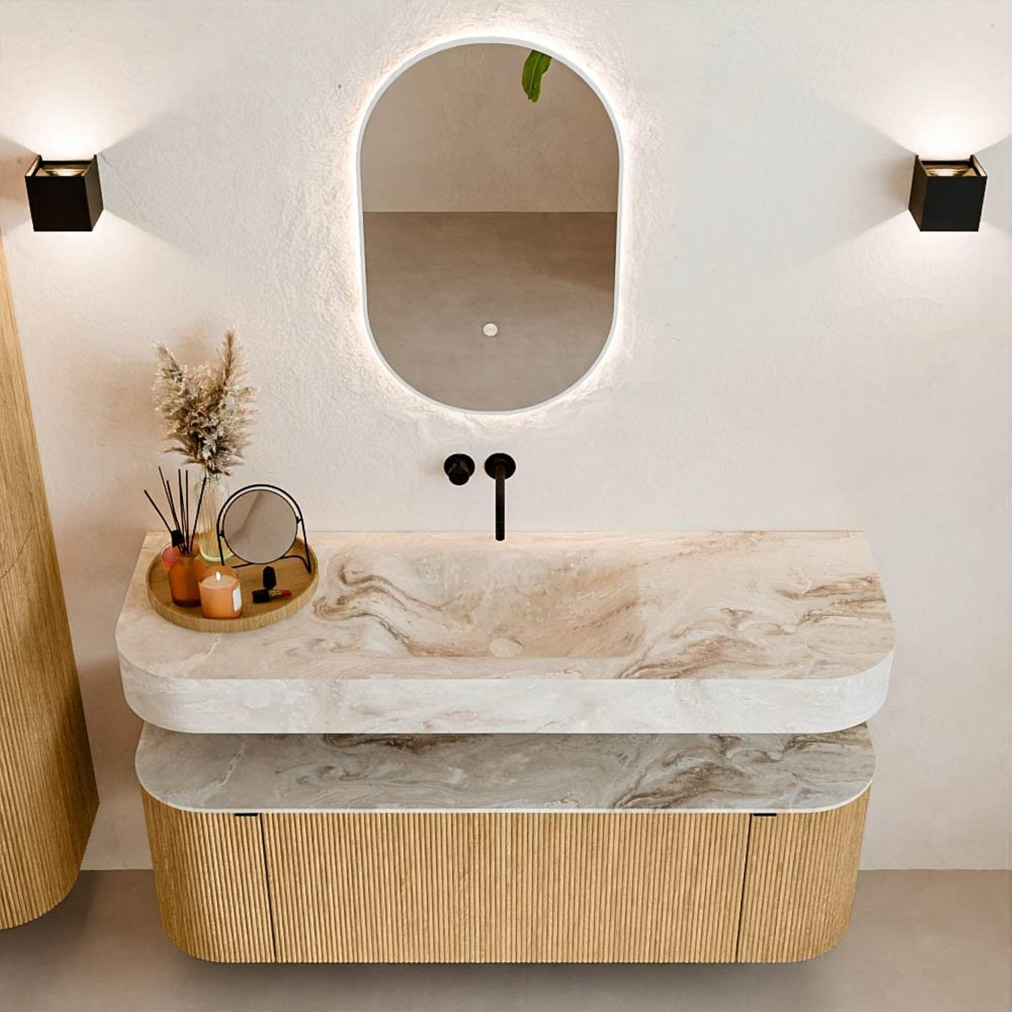 Au-dessus du meuble flotte une vasque suspendue assortie aux coins arrondis – parfaitement adaptée à la forme du meuble. La vasque est réalisée en Solid Surface et suit subtilement les lignes du meuble inférieur, créant ainsi un ensemble harmonieux. Le plan de travail en Solid Surface forme une base solide et facile d'entretien et complète la combinaison.