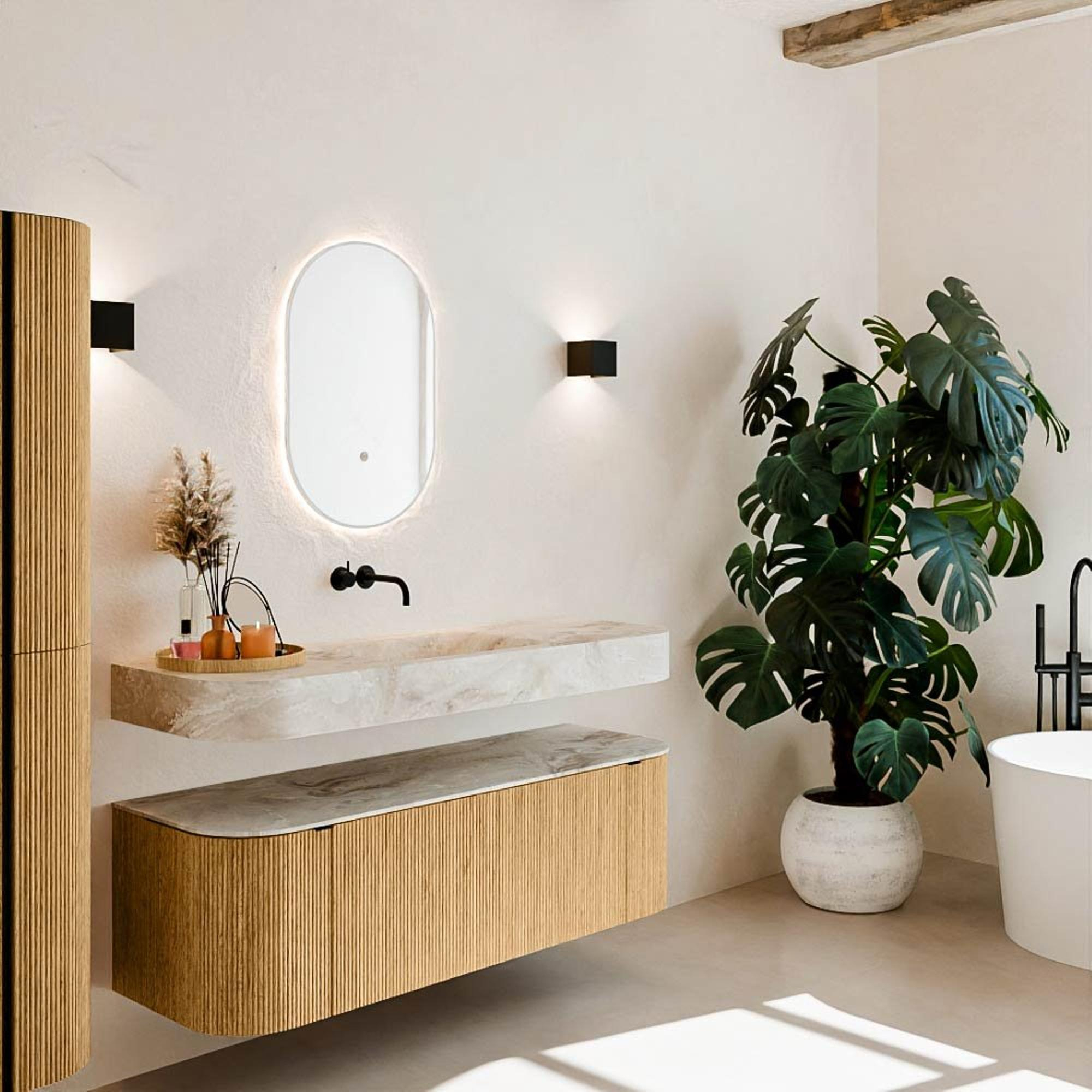 Matériaux naturels dans des tons chauds. Les nervures verticales apportent rythme et texture au design, tandis que le chêne confère une apparence chaleureuse et artisanale. Choisissez parmi 5 teintes de bois OAK, WALNUT, DUSK, SHADOW et RUBY, des couleurs de bois soigneusement sélectionnées pour enrichir les salles de bains modernes et classiques.