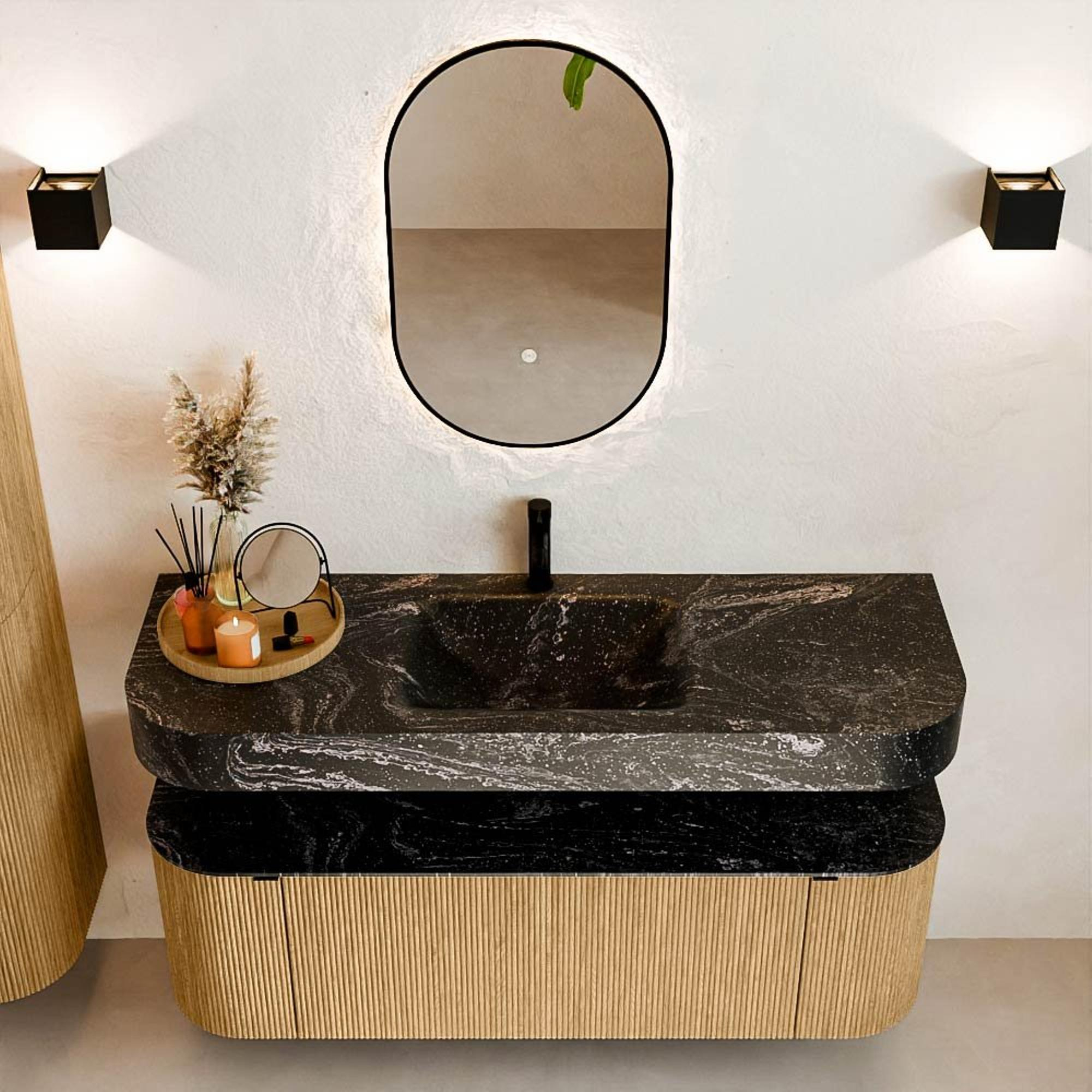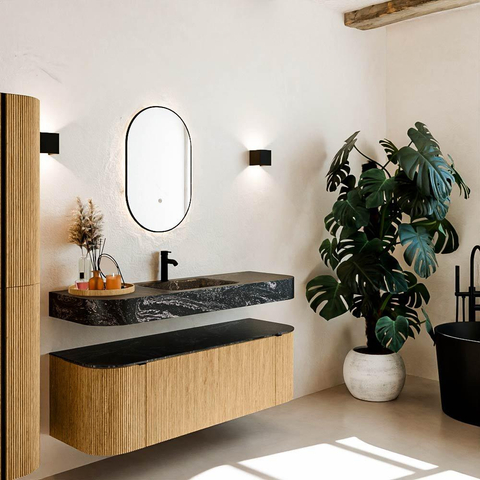 Matériaux naturels aux teintes chaudes. Les cannelures verticales apportent rythme et texture au design, tandis que le chêne confère une apparence chaleureuse et artisanale. Choisissez parmi 5 teintes de bois OAK, WALNUT, DUSK, SHADOW et RUBY, des couleurs de bois soigneusement sélectionnées pour enrichir les salles de bains modernes et classiques.