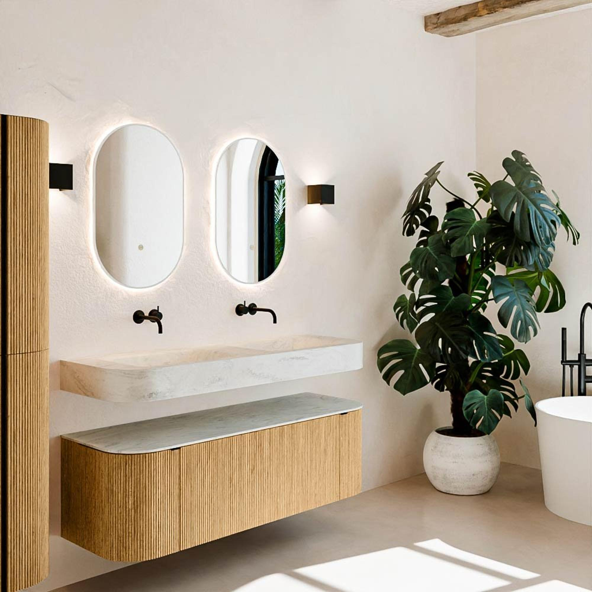 Matériaux naturels dans des tons chauds. Les nervures verticales apportent rythme et texture au design, tandis que le chêne confère une apparence chaleureuse et artisanale. Choisissez parmi 5 teintes de bois OAK, WALNUT, DUSK, SHADOW et RUBY, des couleurs de bois soigneusement sélectionnées pour enrichir les salles de bains modernes et classiques.
