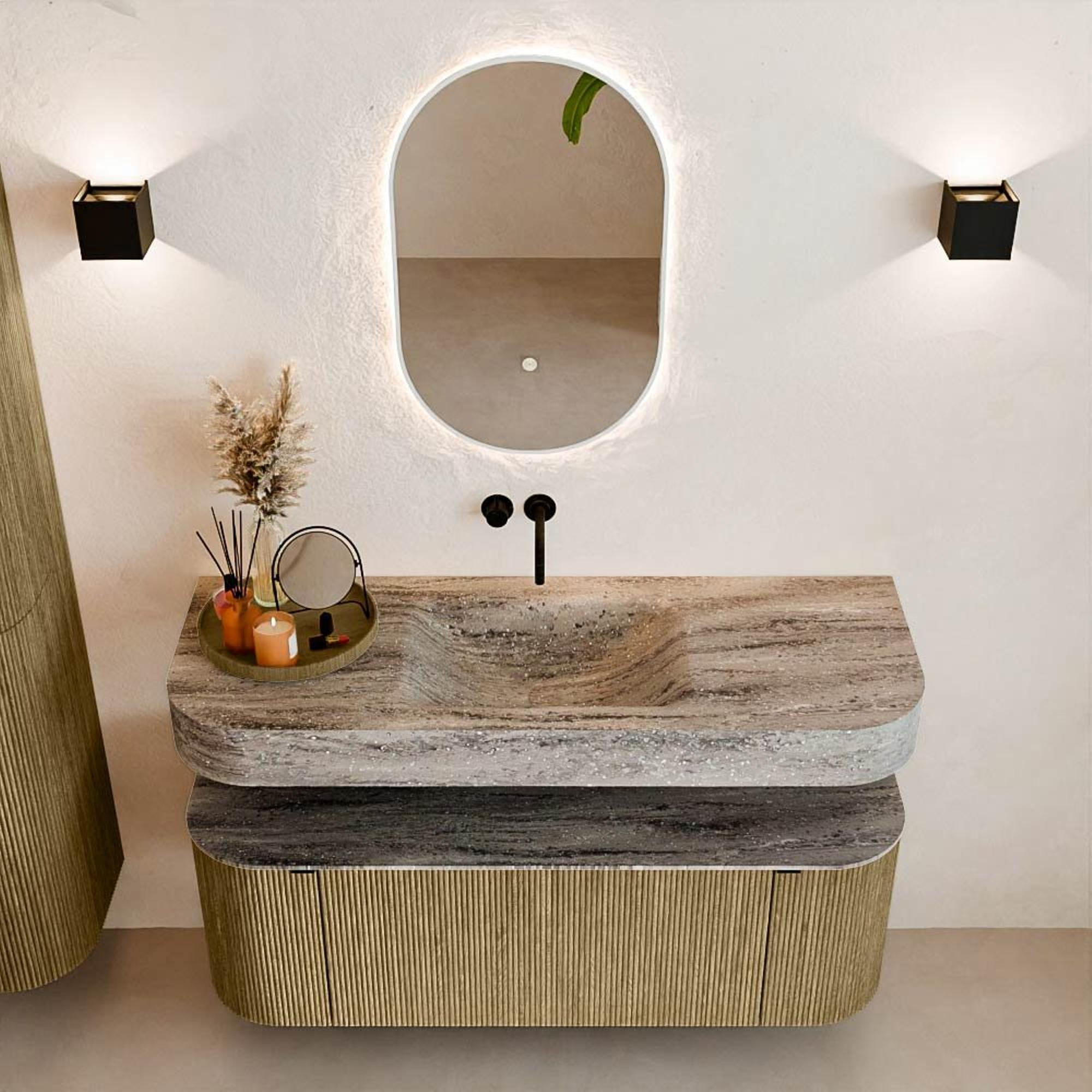 Matériaux naturels aux teintes chaudes. Les nervures verticales apportent rythme et texture au design, tandis que le chêne confère une apparence chaleureuse et artisanale. Choisissez parmi 5 teintes de bois OAK, WALNUT, DUSK, SHADOW et RUBY, des couleurs de bois soigneusement sélectionnées pour enrichir les salles de bains modernes et classiques.
