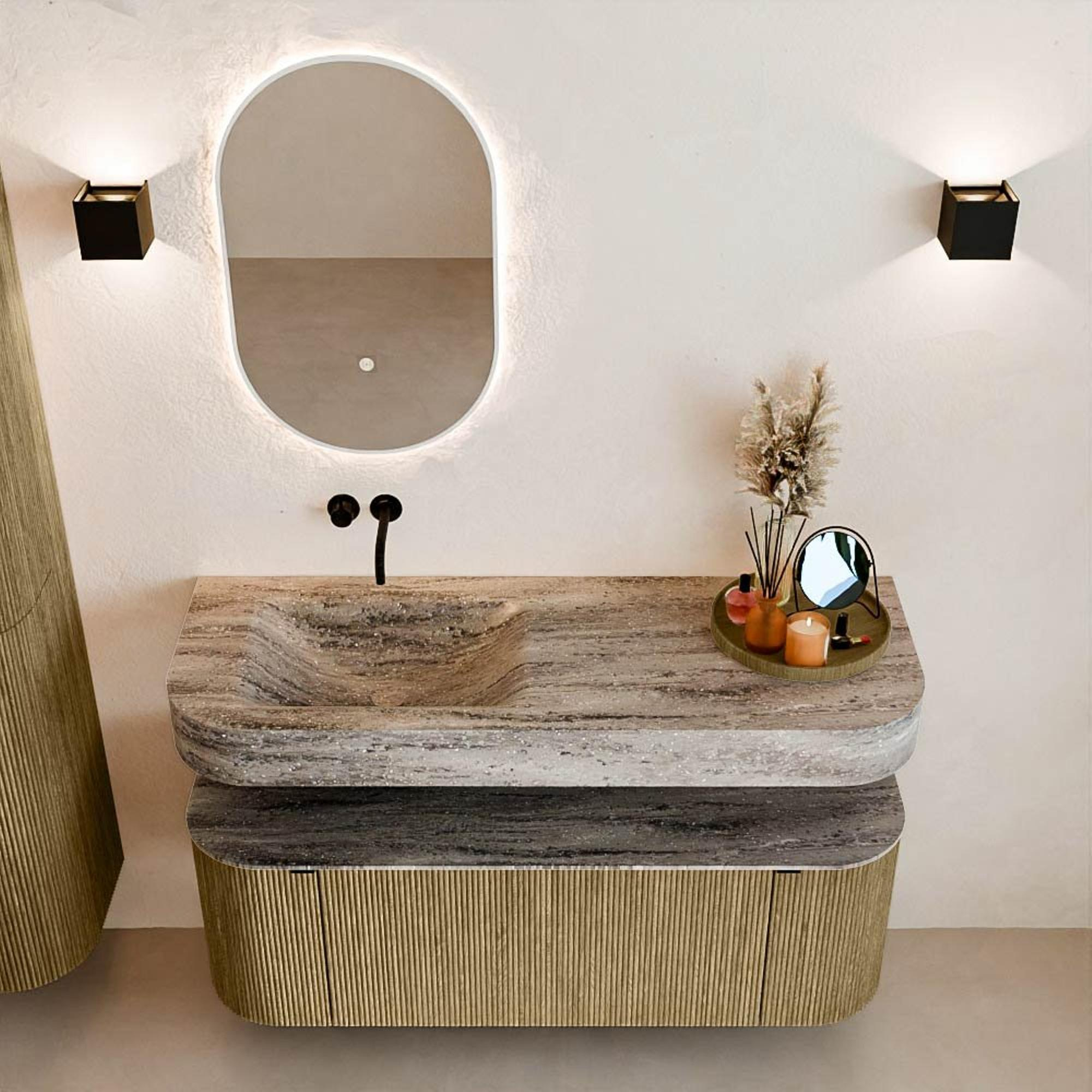 Matériaux naturels dans des tons chauds. Les nervures verticales apportent rythme et texture au design, tandis que le chêne confère une apparence chaleureuse et artisanale. Choisissez parmi 5 teintes de bois OAK, WALNUT, DUSK, SHADOW et RUBY, des couleurs de bois soigneusement sélectionnées pour enrichir les salles de bains modernes et classiques.