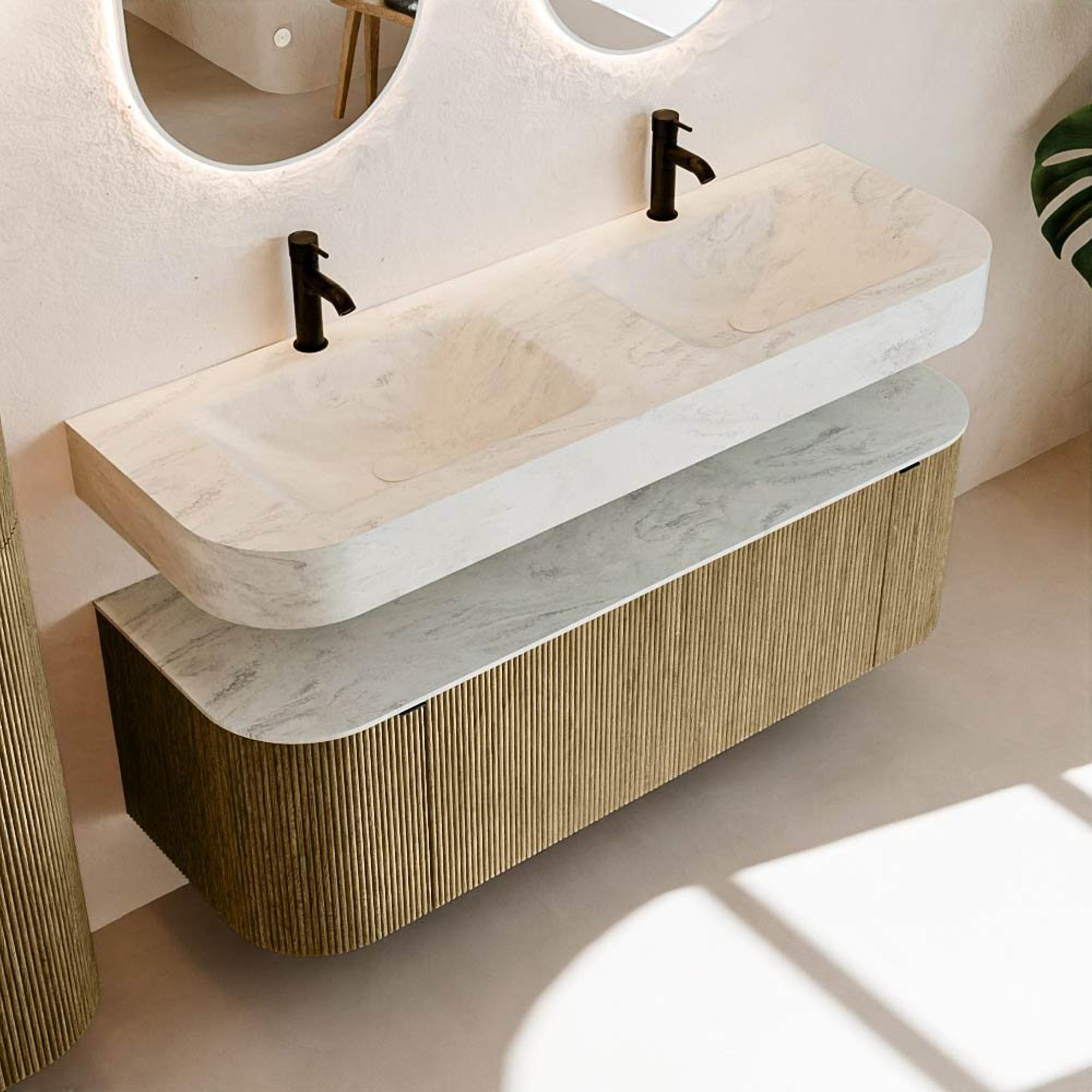 Au-dessus du meuble flotte une vasque suspendue assortie aux coins arrondis – parfaitement adaptée à la forme du meuble. La vasque est réalisée en Solid Surface et suit subtilement les lignes du meuble inférieur, créant ainsi un ensemble harmonieux. Le plan de travail en Solid Surface forme une base solide, facile d'entretien, et complète la combinaison.