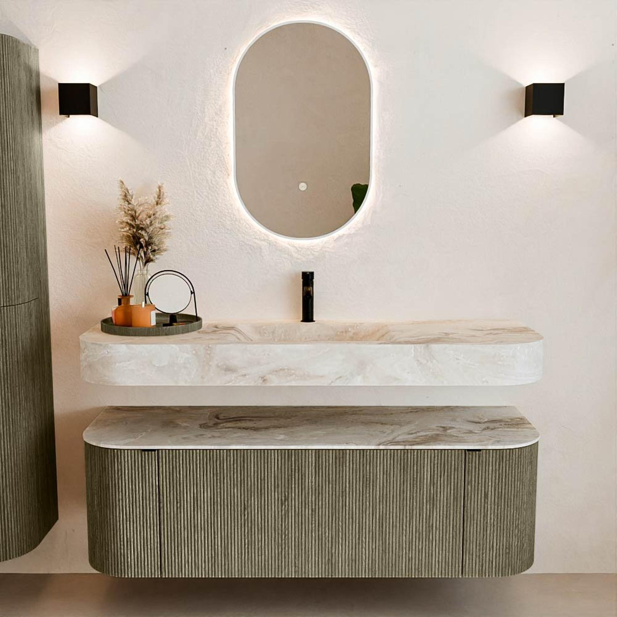 Au-dessus du meuble flotte une vasque suspendue assortie aux coins arrondis – parfaitement adaptée à la forme du meuble. La vasque est réalisée en Solid Surface et suit subtilement les lignes du meuble inférieur, créant ainsi un ensemble harmonieux. Le plan de travail en Solid Surface constitue une base solide, facile d'entretien et complète la combinaison.