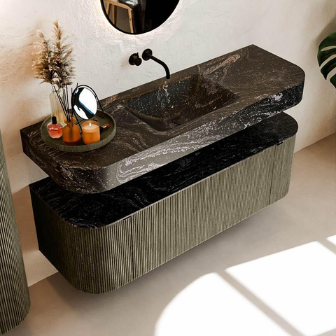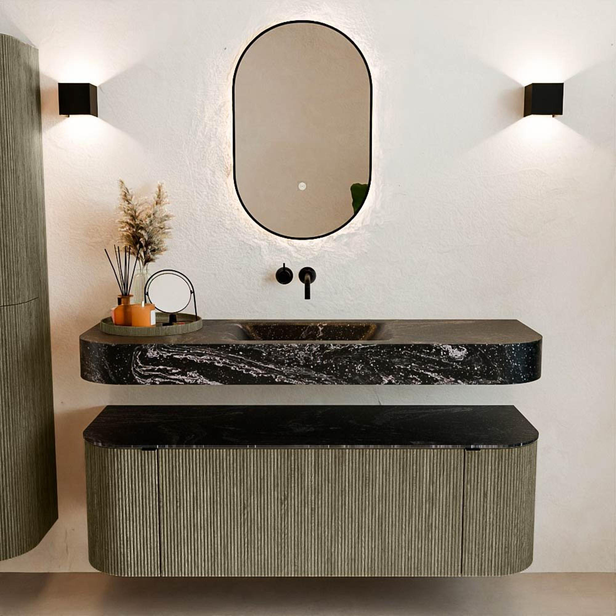 MONDIAZ THOR-DLUX 140cm meuble de salle de bains arrondi gauche + droite couleur Shadow avec 1 tiroir et 2 portes. Vasque suspendue CLOUD Milieu sans trou de robinet couleur Lava.