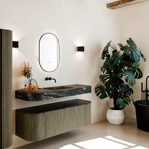 Matériaux naturels dans des tons chauds. Les cannelures verticales apportent rythme et texture au design, tandis que le chêne confère une apparence chaleureuse et artisanale. Choisissez parmi 5 teintes de bois OAK, WALNUT, DUSK, SHADOW et RUBY, des couleurs de bois soigneusement sélectionnées pour enrichir les salles de bains modernes et classiques.