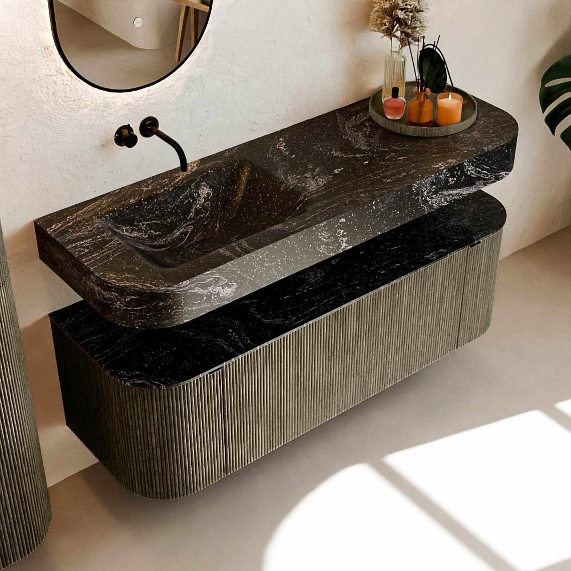 Matériaux naturels aux teintes chaudes. Les cannelures verticales apportent rythme et texture au design, tandis que le chêne confère une apparence chaleureuse et artisanale. Choisissez parmi 5 teintes de bois OAK, WALNUT, DUSK, SHADOW et RUBY, des couleurs de bois soigneusement sélectionnées pour enrichir les salles de bains modernes et classiques.