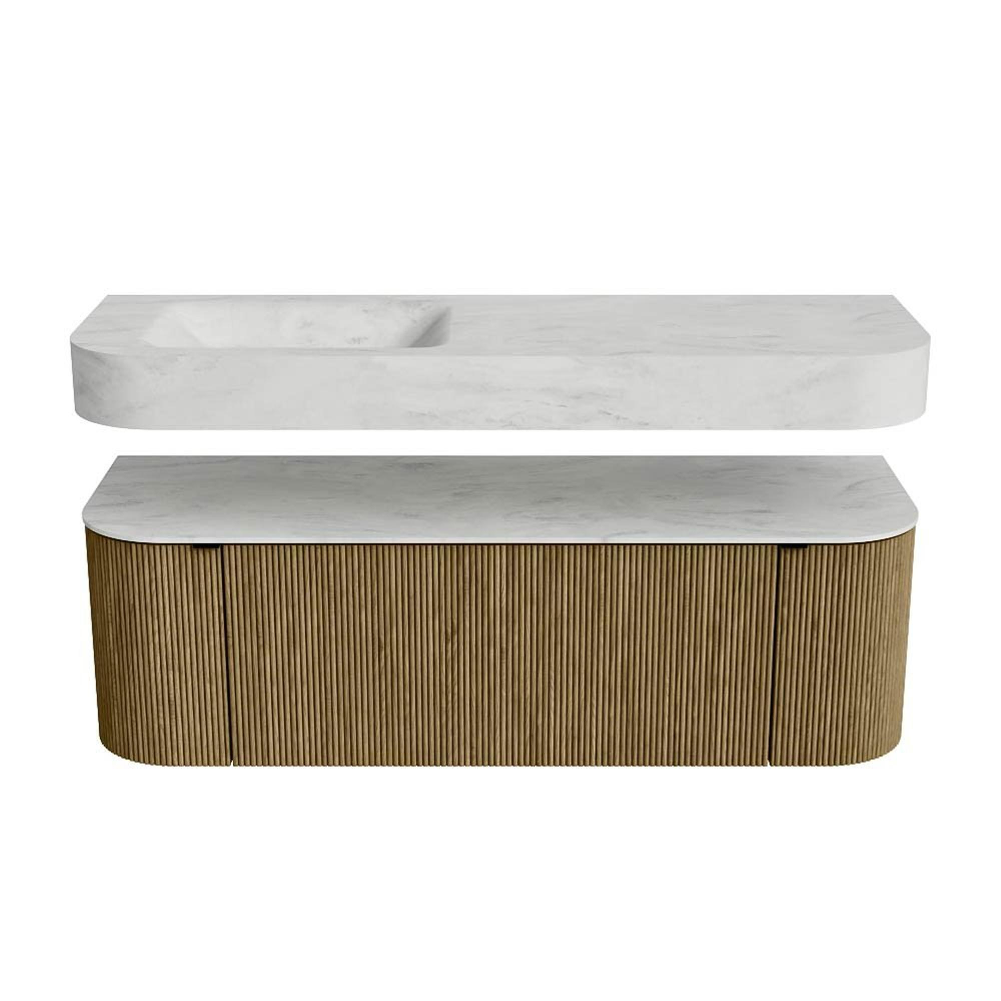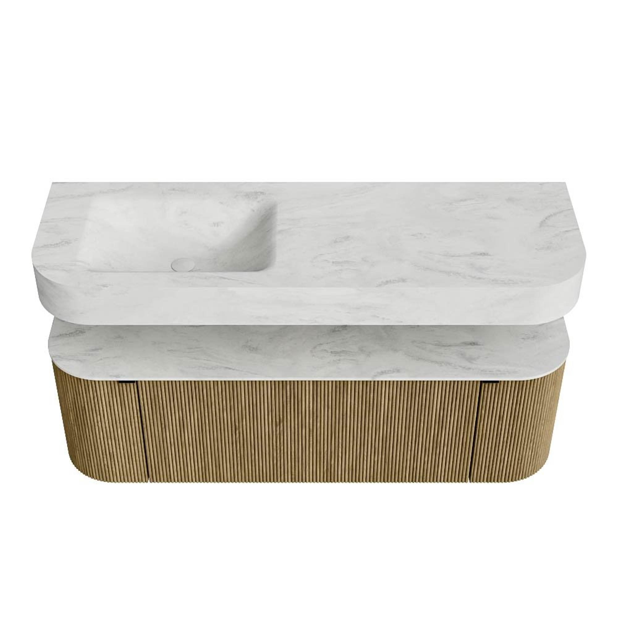 Un lavabo suspendu assorti flotte au-dessus du meuble avec des coins arrondis – parfaitement adapté à la forme du meuble. Réalisé en Solid Surface, le lavabo suit subtilement les lignes du meuble inférieur, créant un ensemble harmonieux. Le plan en Solid Surface forme une base robuste et facile à entretenir, complétant ainsi la combinaison.