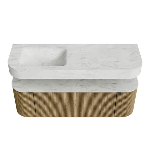 MONDIAZ THOR-DLUX 140cm meuble de salle de bains arrondi gauche + droite couleur Dusk avec 1 tiroir et 2 portes. Vasque suspendue CLOUD gauche 1 trou de robinet couleur Opalo.