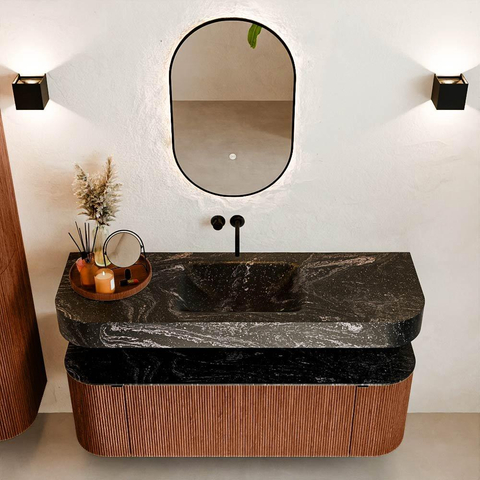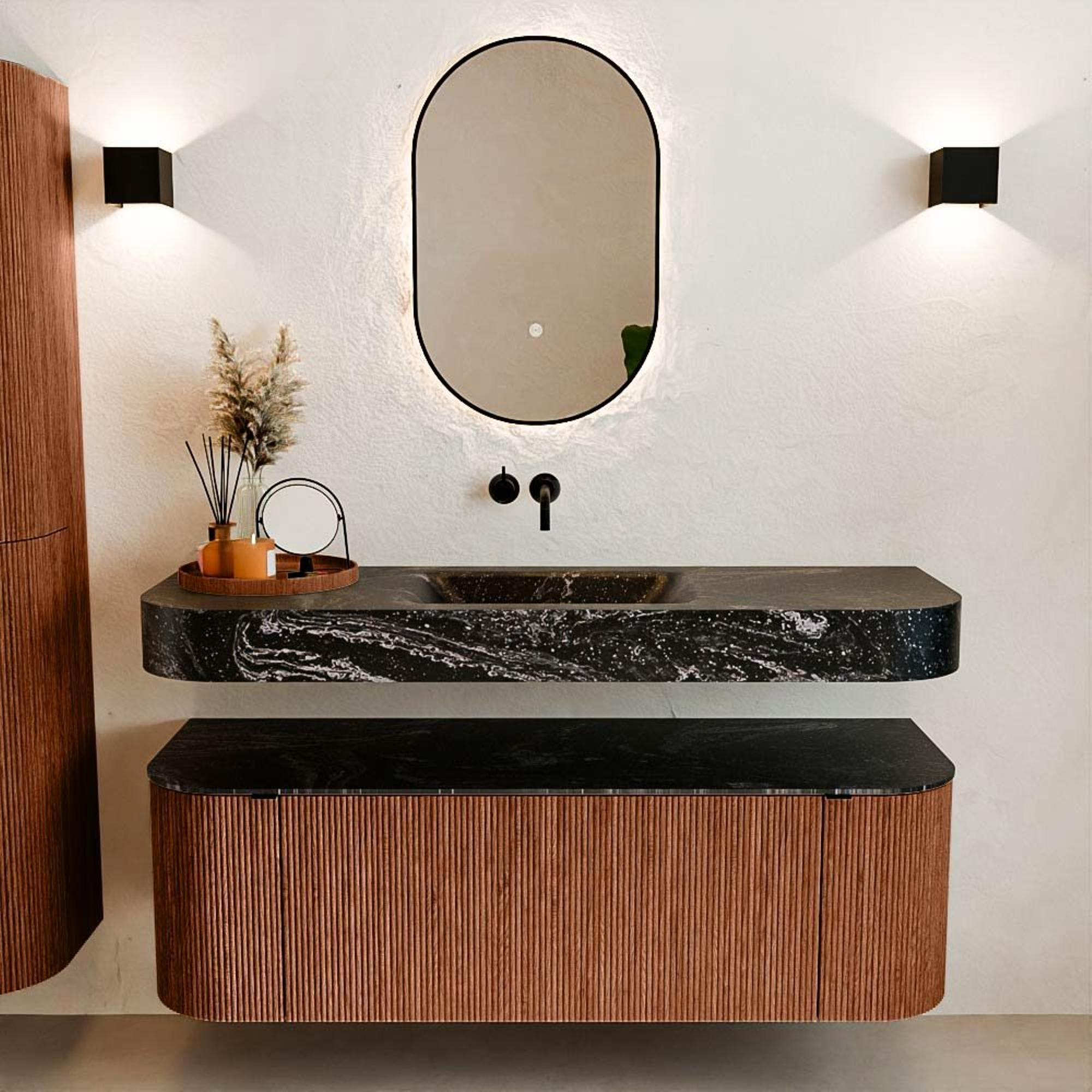 Matériaux naturels dans des tons chauds. Les nervures verticales apportent rythme et texture au design, tandis que le chêne confère une apparence chaleureuse et artisanale. Choisissez parmi 5 teintes de bois OAK, WALNUT, DUSK, SHADOW et RUBY, des couleurs de bois soigneusement sélectionnées pour enrichir les salles de bains modernes et classiques.