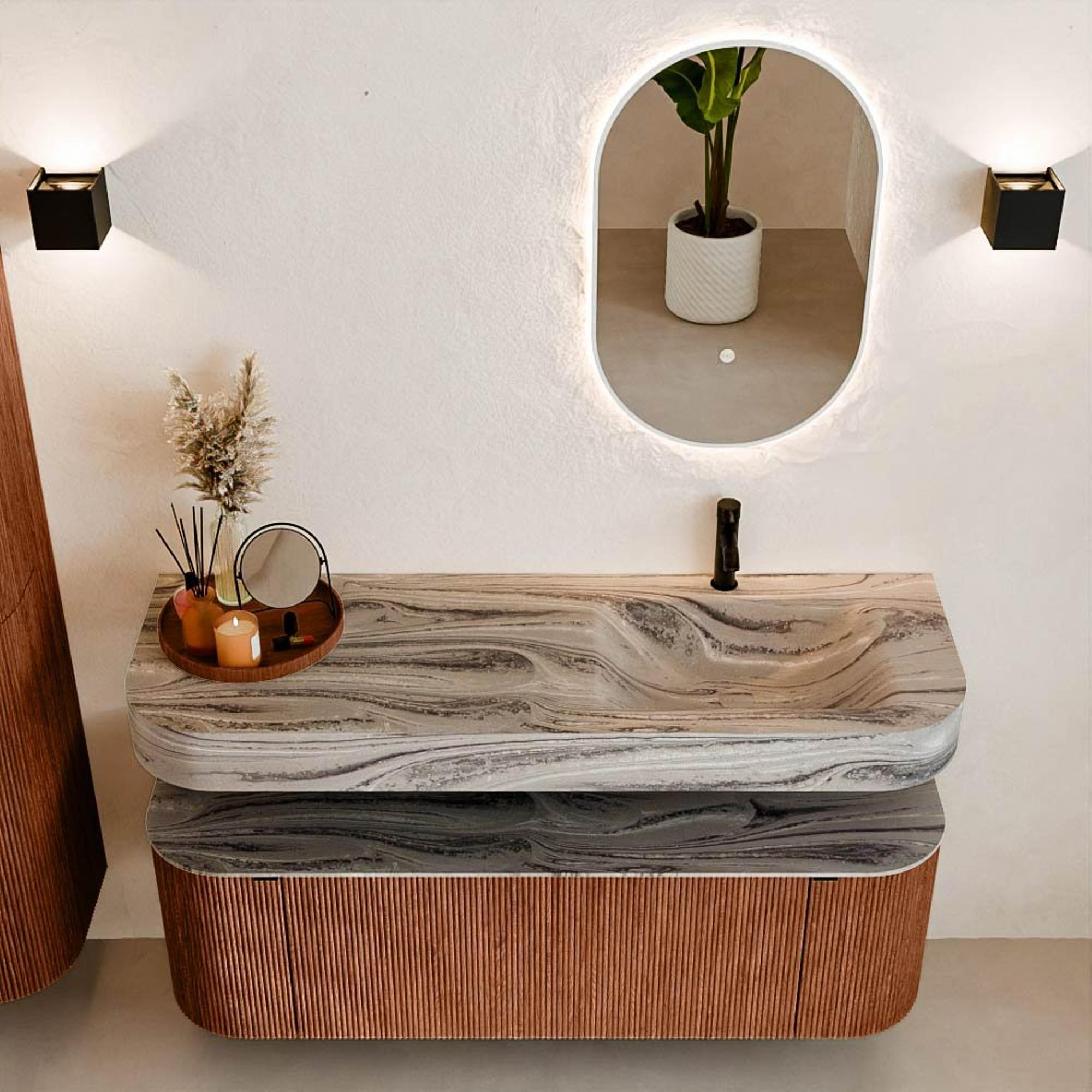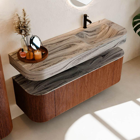 Matériaux naturels dans des tons chauds. Les nervures verticales apportent rythme et texture au design, tandis que le chêne confère une apparence chaleureuse et artisanale. Choisissez parmi 5 teintes de bois OAK, WALNUT, DUSK, SHADOW et RUBY, des couleurs de bois soigneusement sélectionnées pour enrichir les salles de bains modernes et classiques.