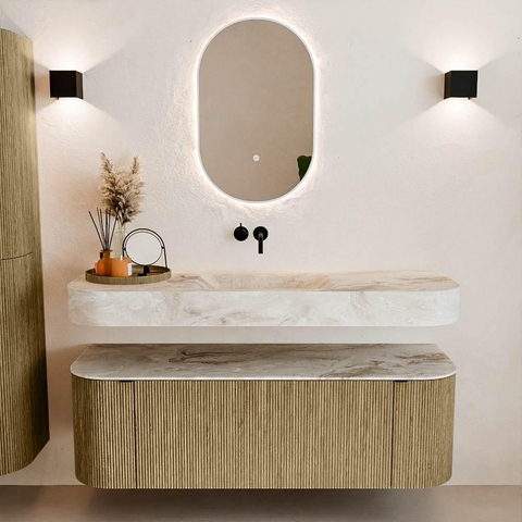 Matériaux naturels dans des tons chauds. Les cannelures verticales apportent rythme et texture au design, tandis que le chêne confère une apparence chaleureuse et artisanale. Choisissez parmi 5 teintes de bois OAK, WALNUT, DUSK, SHADOW et RUBY, des couleurs de bois soigneusement sélectionnées pour enrichir les salles de bains modernes et classiques.